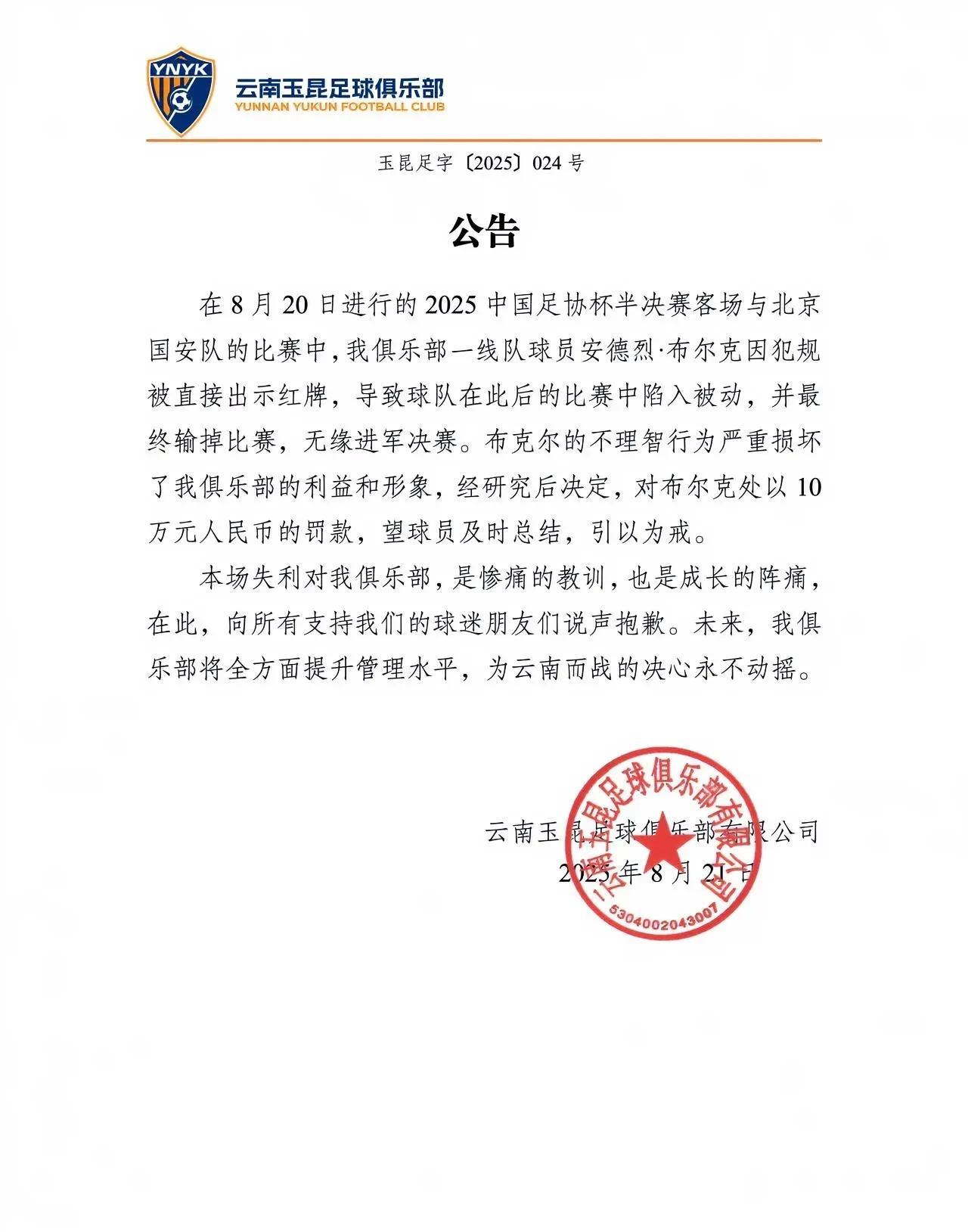 布尔克偷鸡不成蚀把米! 刚刚,云南玉昆足球俱乐部发布了官方声明,宣布对染红的球员