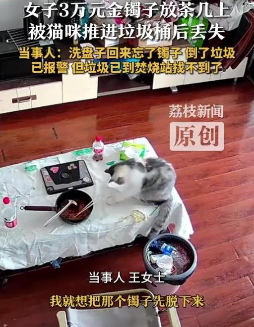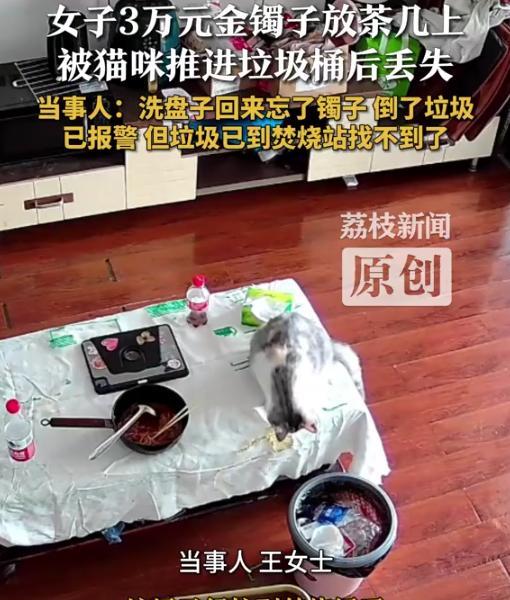 解释不清了!广西桂林,女子把价值30000元的金镯子放到茶几上,可几小时后等她想起来,却发现手镯不见了,可家里明明没人来过,只有她自己,调取监控后,才发现是被小猫给扔了,而等她找到垃圾站,垃圾已经送到了焚烧站 监控显示,当时王女士正在客厅的茶几上吃饭,因为盘子上有油,她就把手镯摘下来,放到了一边,谁料就在她去卫生间洗手的几分钟里,家里那只平时可爱的小猫,突然跳上茶几,爪子一扒拉,叮当一声,金镯子掉进了旁边的垃圾桶 王女士完全没察觉。直到几小时后猛地想起来,再找,茶几上早已空荡荡。她第一反应是家里进人了?可门窗都好好的。翻遍沙发缝、地毯下,什么都没有。最后只好调监控,这一看,傻眼了 她赶紧冲到垃圾桶边,但垃圾早已在半夜被她顺手扔掉了。报警、联系物业、跑垃圾站……一路追查,才发现那袋垃圾早已被运往焚烧站 有网友调侃说:这下猫猫身价又涨三万,以后更得好好伺候,想想沉没成本呀! 其实调侃归调侃,但这事谁遇到了都会心疼,一个瞬间的疏忽,三万块就这么没了。说心疼是真心疼,但怪猫吗?猫也不知道那亮晶晶的东西值钱,它可能就是觉得好玩,或者单纯想把它推下去,就像它们平时推杯子、推笔、推一切能推的东西那样 很多养猫的人一看就懂:猫就是这样一种生物,它对物品的价值毫无概念,却对“推下去”这个动作有无穷的热情。你的手机、钥匙、口红,在猫眼里和一块小纸团没什么区别,只要在桌边,都可能成为它们的目标 所以说,养宠物的人家里,本来就该尽量避免把贵重东西随手乱放,特别是桌子边缘,猫狗的好奇心和探索欲,是真的难防