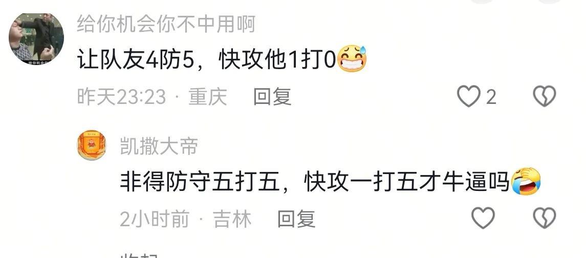 这评论真是让人琢磨不透。 给你机会你不中中用的这位网友道出了某一位自称“GOAT”在防守与快攻之间的换算。其意思无非是一个角色球员负责打球场上最简单的篮球,而其余四人则是给这个人兜底。对防守者来说这是极大的挑战,因为球场上多一人的话就意味着多出一个空位投篮点,同时对于对手的后场则变成了1打0的局面,这种情况下只要是一个身体健全且运动能力正常不是坡脚的人十有八九会把这个空篮上进。可是另一位叫“凯撒大帝”的网友却说篮球不需要五人全都防守,快攻一打五才厉害的话。我想对这位网友说,五防五是基本盘是防守者在场上最重要的事情,联盟里流传着这样的话“进攻可以赢的胜利防守才可以赢的总冠军”。再来说说那位网友后半句话吧,快攻一打五。一打五不叫快攻了,快攻的意思是多打少,不是少打多。