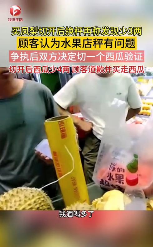 “花钱买教训!”近日,安徽芜湖,一男子从水果店买了个凤梨,到隔壁称重后发现少了3两,他认为水果店的称有问题,而老板则表示这是正常现象!因为水果切开后会有水分流失,二人争执不下就报了警,最终在民警的监督下又切了个西瓜,结果证实称没有问题,男子又掏钱买走了西瓜。 在购物时,尤其是水产品,最害怕遇到黑心的商家,不沥水直接就称重,随随便便就被坑个几十块钱。虽然在有关部门的监督下,这种情况很少发生,但不怕一万就怕万一! 据媒体8月20日的报道,这天晚上,男子吃完饭后去水果店买凤梨吃,付完钱后他又来到隔壁店复称,结果发现切好后的凤梨比没切前少了3两,他认为自己被骗了,就回去找水果店老板娘谈说法。 老板娘告诉男子,这是因为水果在切的过程中,会流失一定的水分,别说少3两了,就是少半斤也是正常现象。 可男子不认同这套说辞,最终报了警。 在民警的见证下,老板娘决定现场切一个西瓜以证清白,男子表示如果损失低于3两就由他买单,老板娘也同意如果大于3两就退还给男子100元钱。 经过称重,西瓜刚好轻了3两,男子对老板娘道了歉并买走了西瓜,事情顺利解决。 网友看后表示,难道这不是常识吗?不仅会流失水分,切掉的皮也是重量啊! 信息来源:《顾客认为水果店的秤有问题,水果店店员称只是切开后的正常水分流失,两人为此争执难休,还叫来了民警。在民警的见证下,店员切西瓜证明。最终,顾客道歉并买走切开的西瓜。》AHTV第一时间