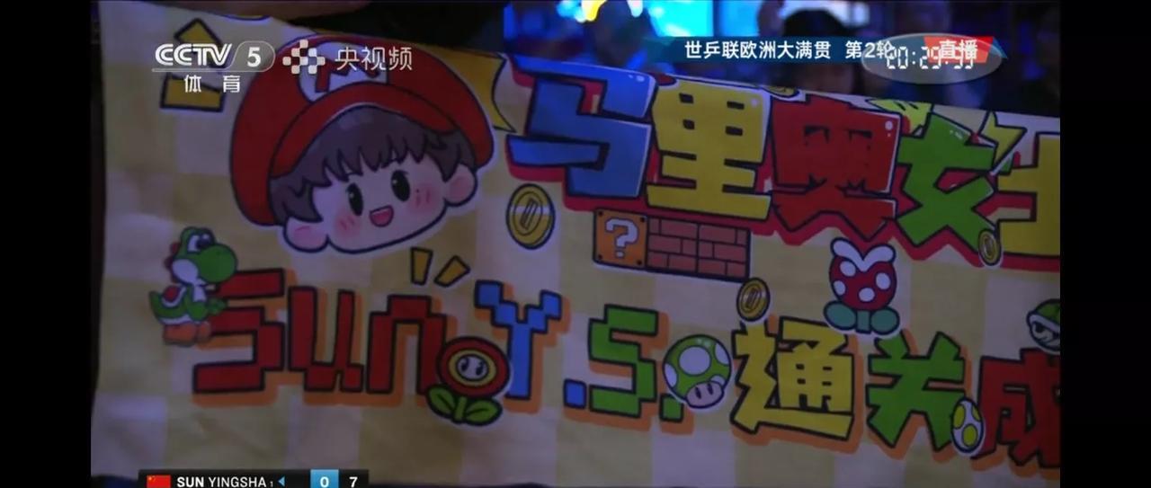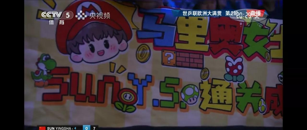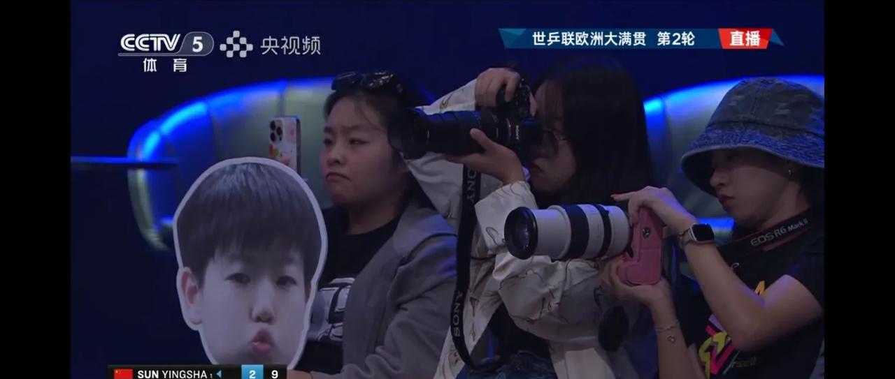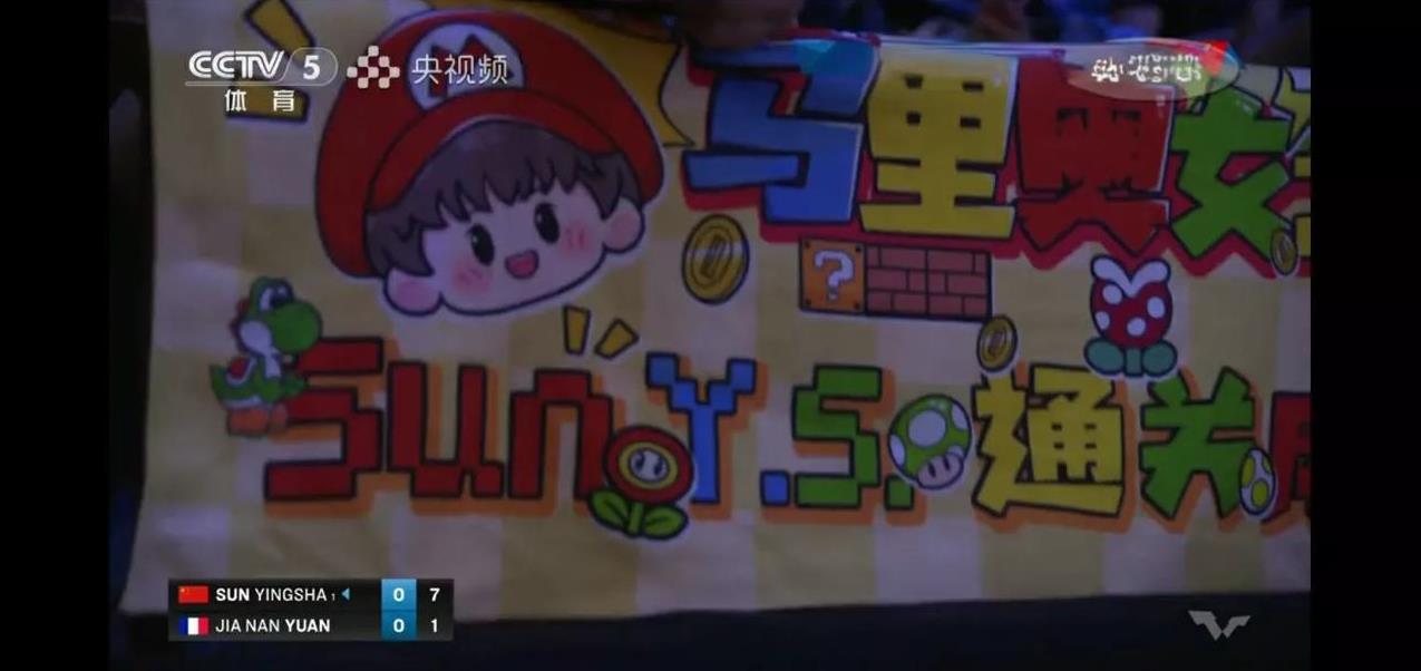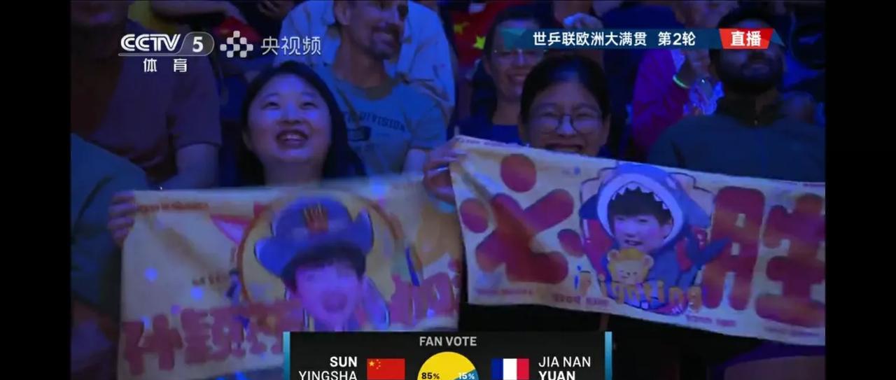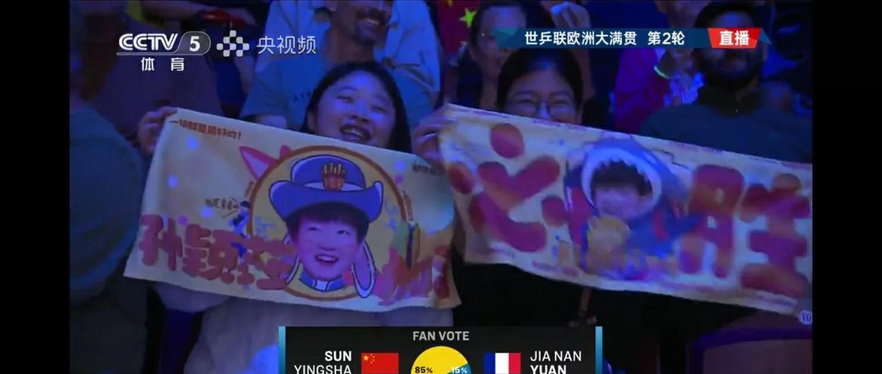 孙颖莎和袁嘉楠的比赛现场的球迷真是给力,用尽心思,各种孙颖莎的道具设计的图案令人