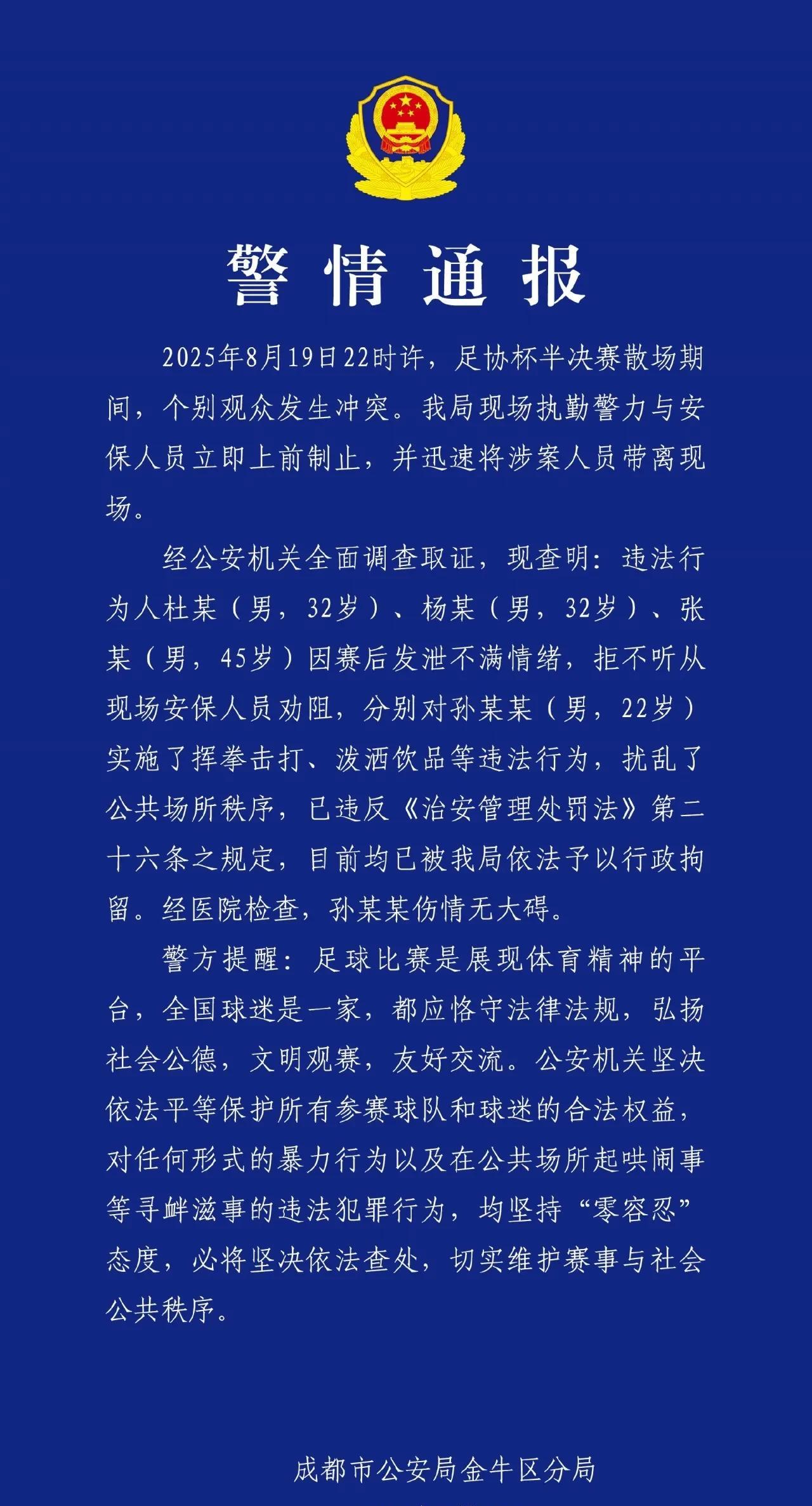 对于足球流氓,就应该严惩,拘留是不是还轻了点。输球又输人!足协杯半决赛成都蓉城主场点球输给河南队,成都蓉城球迷为发泄不满情绪,不顾保安劝阻殴打河南球迷,警方对打人的三名球迷给予拘留处罚,可谓大快人心。 无事不报,时候未到!像成都蓉城球迷的这种行为,不但丢了成都蓉城俱乐部的脸,也影响了成都的城市形象,就应该拘留。 那么问题来了,对打人的球迷给予拘留处罚,您认为合理吗?#中国足球#