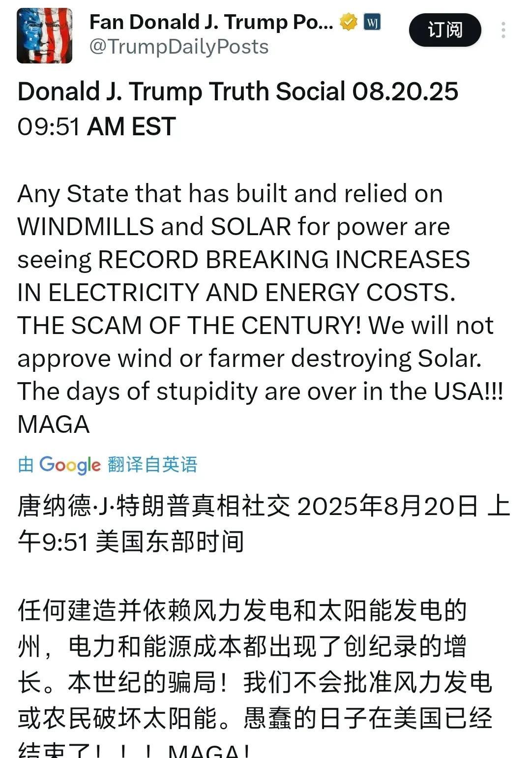 美国总统特朗普昨晚(8月20日)写道:“任何依赖风力发电和太阳能发电的州都在经历创纪录电力和能源成本上涨。这是本世纪最大的骗局!我们不会批准破坏农民土地的风能和太阳能建设项目。美国的愚蠢时代已经结束了!!!让美国再次伟大!” 美国视国际组织为儿戏,退群毀约成瘾,今天退,明天加,后天再退,变脸之快令世界匪夷所思、无所适从。奥巴马政府加入《巴黎协定》,要求各国增加绿色能源投入,并承诺给发展中国家每年1000亿美元的补贴,各国翘首以盼,等来的却是特朗普政府的退出,拜登政府上任后再加入,现在特朗普政府又退出,美国的国家信誉何在?退群毀约就能“让美国再次伟大”?