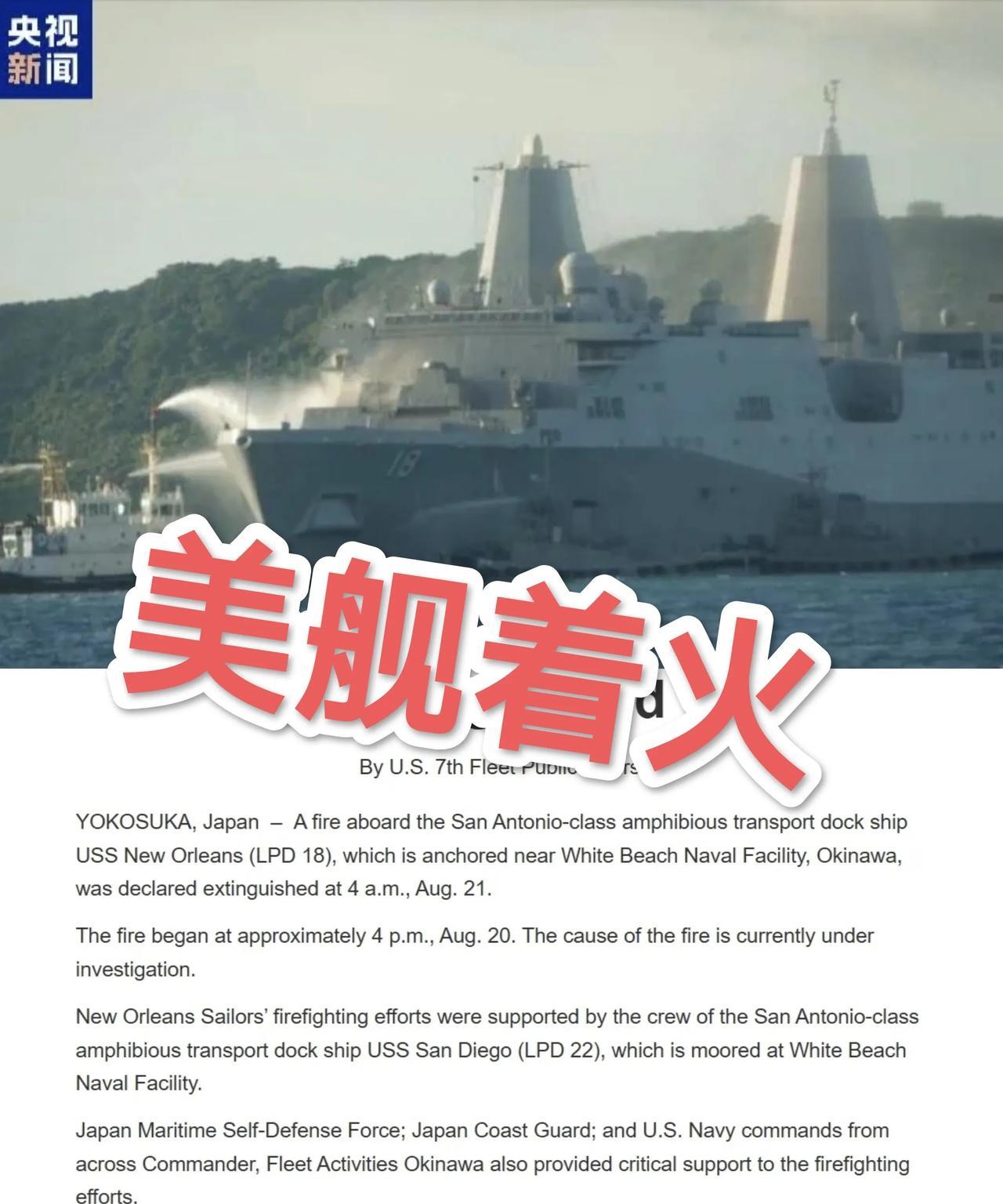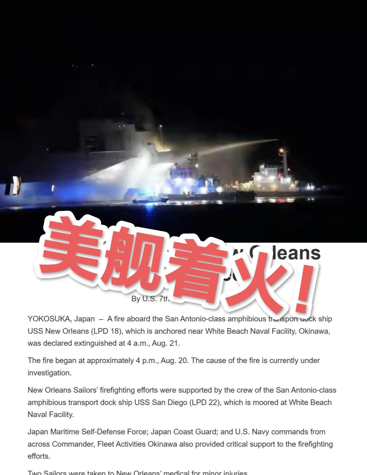 火烧美国军舰,美军反复致电日本求援,日本救援迟迟未行? 美军“新奥尔良”两西登陆舰着火,从8月20日16时火灾发生,17时美军通报日本海上保安厅救援,被日本取消行动。19时30分再度通报日本保安厅。直到8月21日凌晨才被扑来,差不多烧了12小时。 美军认为在21日4点火灭了,但日本保安部却表示在21日上午8点才扑灭,烧了15个小时。日本海上自卫队派出2艘拖船参与灭火。 从这里边可以看出,美军舰在日本遇上事了,日本国内的行动迟迟未成行,经过几次呼救才出动救援,这表明所谓的美日同盟关系 真如美国所说的如此“铁”吗?日本海上保安厅的迟援可能接下来会被美军指责一顿。同时美国军舰着火,难道美军自个救不了吗? 如果美国军舰在大海上着火,靠谁救呢? 这表明美军自身的救援力量太弱小了,舰上的救援设备难道没有用?还要靠日本海上保安部来救,这可以说明,美军的军舰能力是如何了? 另外,美军说烧了12小时,而日本说烧了15个小时,这里头也大有文章,美军也许报喜不报忧,谎报军情?这也可以看出美军内部的管理问题很松散,纪律不严明,这么大的灾情汇报存在很大的水份! 从这件事件来看,美日关系并不是传闻中的那么好, 美军自身救援力量太差,特别是战时发生着火,自救不了就跳海! 而是否存在谎报灾情问题,这个涉及军情弃报问题! 也许从这件事来看,美军真不是传闻中的“如此强大”!