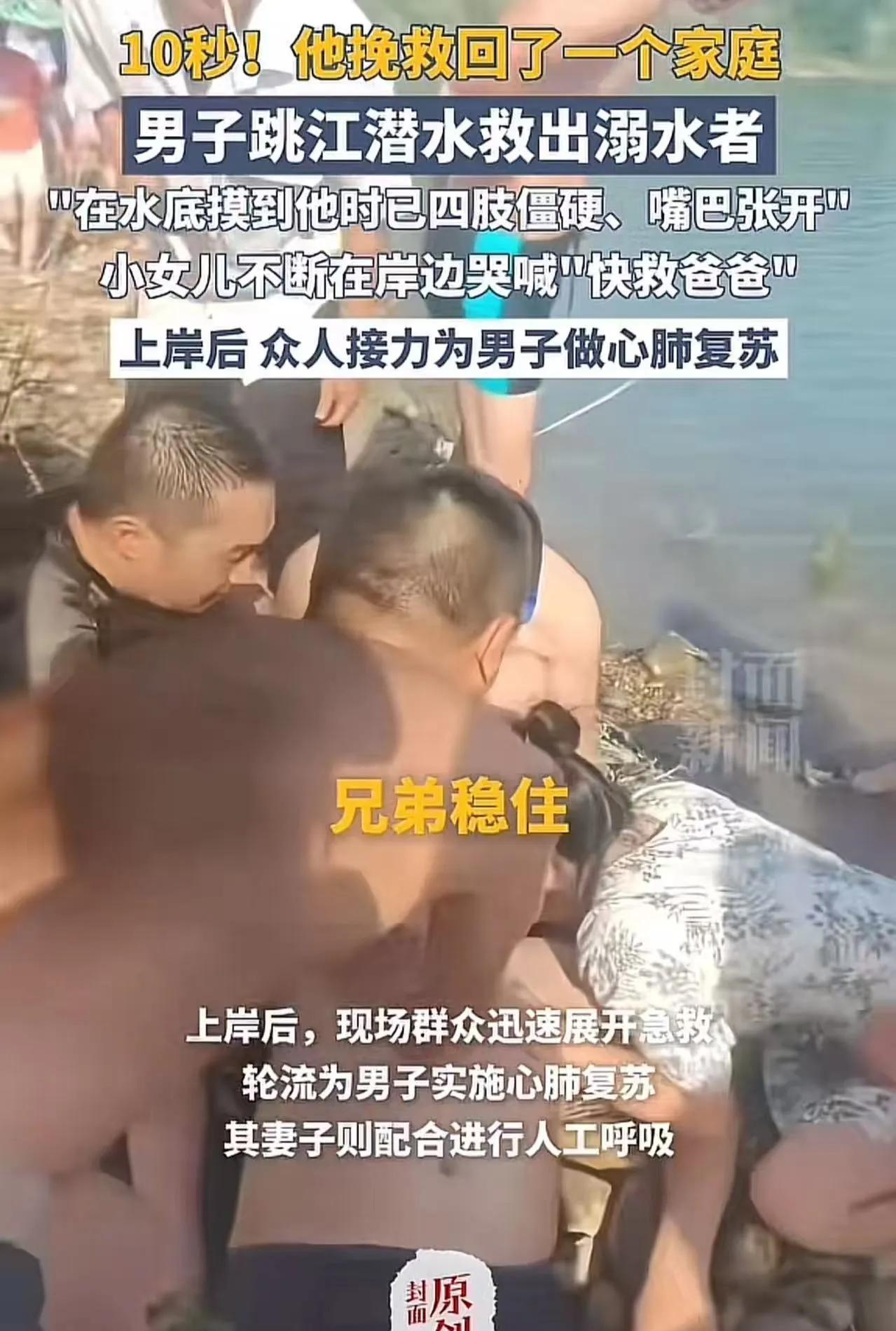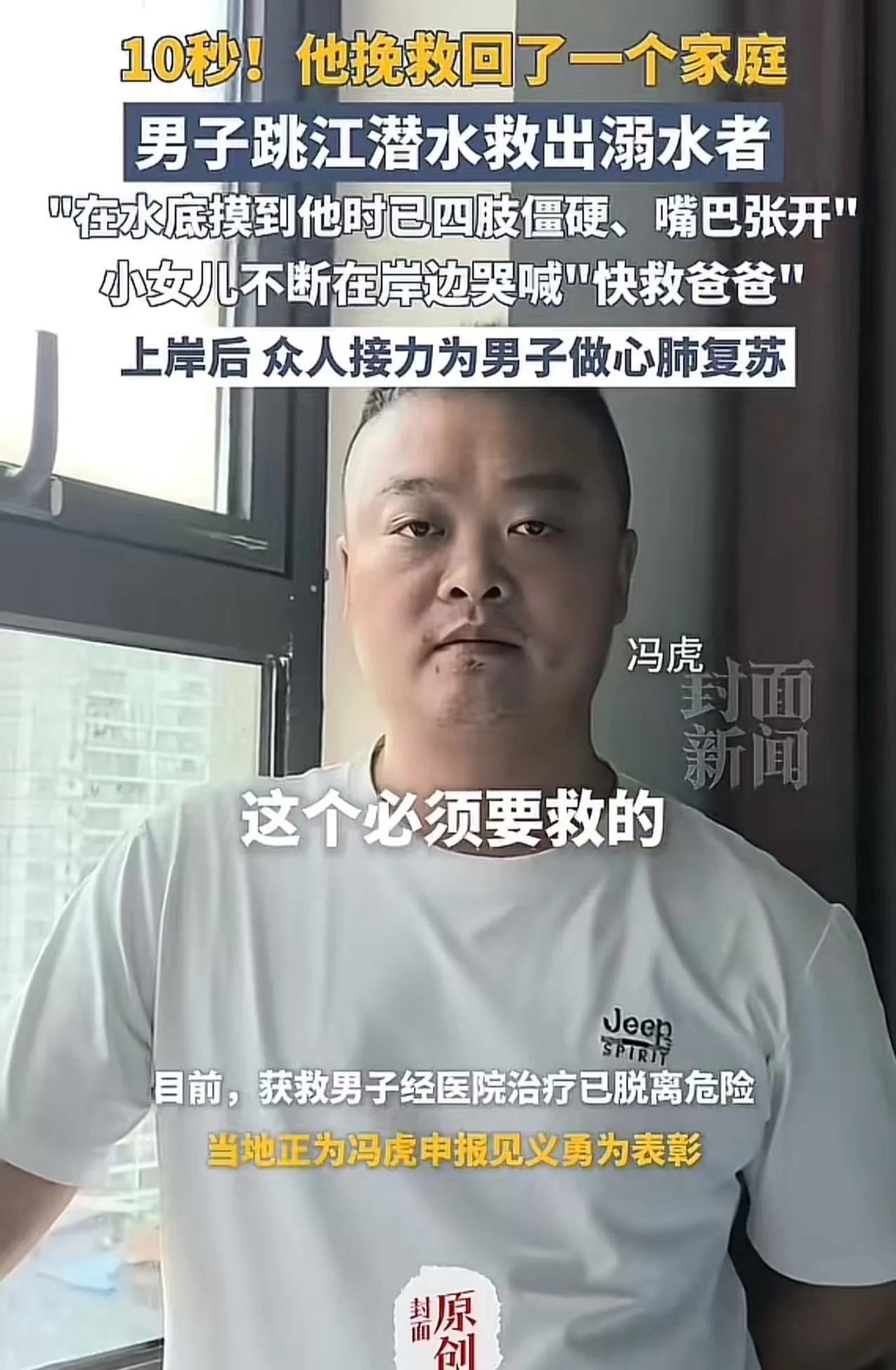 “10秒!他挽救了一个家庭!”四川广安,一个小女孩子在岸边大喊:“快救我爸爸!”男子听到后,毫不犹豫地潜入水中救出溺水者!救人男子:“在水底摸到他时已四肢僵硬,嘴巴张开。”小女儿不断在岸边哭喊“快救我爸爸!” (来源:封面新闻) 救人英雄冯虎回忆道,那日他正在河边休息,突然间,一位女子正声嘶力竭地呼救,原来她的丈夫不慎溺水,此刻已沉入河底,情况十分危急。 冯虎心中一紧,立刻询问沉水方位。女子颤抖的手指指向河面,冯虎心领神会,丝毫没有犹豫,纵身一跃,朝着目标区域奋力潜去。 在幽暗的水底,冯虎凭借着超凡的水性与冷静的判断,找到了溺水男子的踪迹。 他迅速游近,紧紧抓住男子的双脚,用尽全身力气蹬水而上,把男子托出水面。随后在众人的齐心协力下,将其安全转移至岸边。 可是,眼前的男子脸色苍白如纸,呼吸全无。女儿见状,泪如雨下,哭喊着恳求众人救救她的父亲。 妻子更是吓得双腿发软,她难以想象失去丈夫后的生活该如何继续。 危急时刻,现场群众迅速行动起来,轮流为溺水男子实施心肺复苏术,同时指导妻子配合进行人工呼吸。 不久,救护车赶到现场,医护人员迅速接手,将男子送往医院进行进一步救治。好消息传来,男子已脱离生命危险…… 面对赞誉,冯虎只是朴实地说:“救人,从来不需要考虑。那是一条鲜活的生命,是一个家庭的顶梁柱,怎能不救?” 目前,当地正为冯虎申报见义勇为表彰。 此事引发热议,有网友说,真的牛啊,这是再 生父母啊,身体都僵了,嘴巴都张开了,水底拉上来的,还把他救活了,真的一辈子得感谢这救命的人! 也有网友说, 不幸中的万幸,运气真的好,遇到了敢跟阎王爷抢人的英雄! 还有网友说,不会游泳的怎么老想去大河里面玩呢,真是想不通! 冯虎不只是救了一个人,而是拯救了一个家庭!他的英勇之举,如同一束温暖的光,照亮了人性的美好,也让我们看到了在危难时刻,总有人挺身而出!
