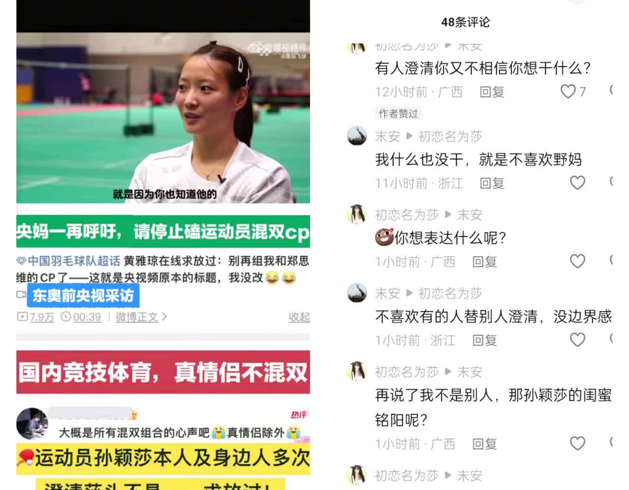 孙颖莎闺蜜孙铭阳澄清过“莎头CP”,孙颖莎本人也在微博澄清过,可惜还是有人“恶意炒CP”,这对运动员伤害极大! 例如羽毛球球员黄雅琼接受采访时,说:我和郑思维就是普通搭档,求放过,别再磕CP,这对他女朋友不好! 是啊!这样盲目磕“莎头CP”,如果王楚钦有女朋友,都只能私底下偷偷交往,不敢公开,就怕女朋友被网暴。那样的话,孙颖莎会觉得非常自责! 请大家放过孙颖莎吧,别再盲目磕“莎头CP”了!