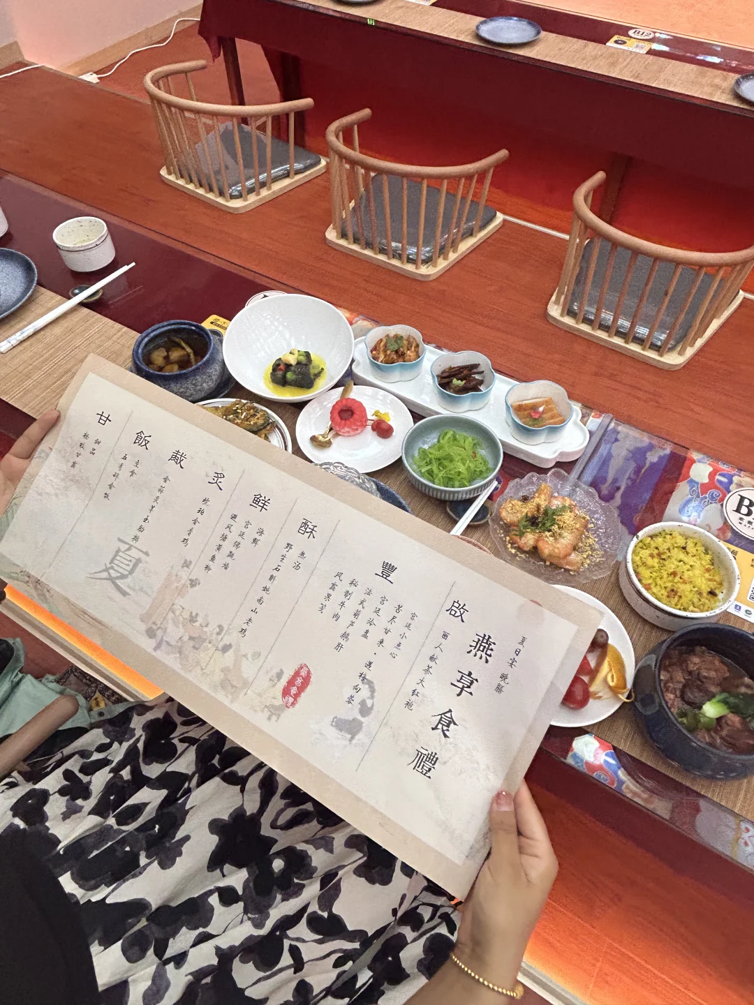古色古香的宫廷式装修,店员身着古装、轻覆面纱上菜~ ,一步入餐厅便仿佛穿越进古代宫廷。 我和朋友提前到店了,还换了喜欢的🆓古装哦,在这里,既能品尝精致佳肴,又能欣赏沉浸式演出,在这里,用餐成为一场文化盛宴🪷。