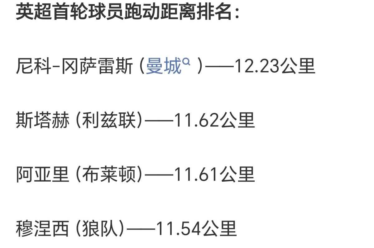 依然跑不死!曼城跑动双星! 英超首轮结束,整个联盟的跑动王是谁呢?曼城中场