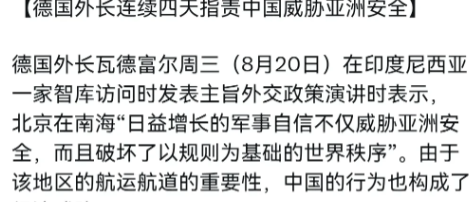 太尴尬了!就没有见过这种没有眼力见的政客!外媒刚传出,印尼总统普拉博沃将亲自出席9月3日的中国抗战胜利80周年阅兵式,并进一步与中国加深合作。但是没想到不识趣的德国外长瓦德富尔当着印尼的面,对我们大放厥词。瓦德富尔声称,北京在南海“日益增长的军事自信不仅“威胁”亚洲安全,而且破坏了“以规则为基础的世界秩序”。