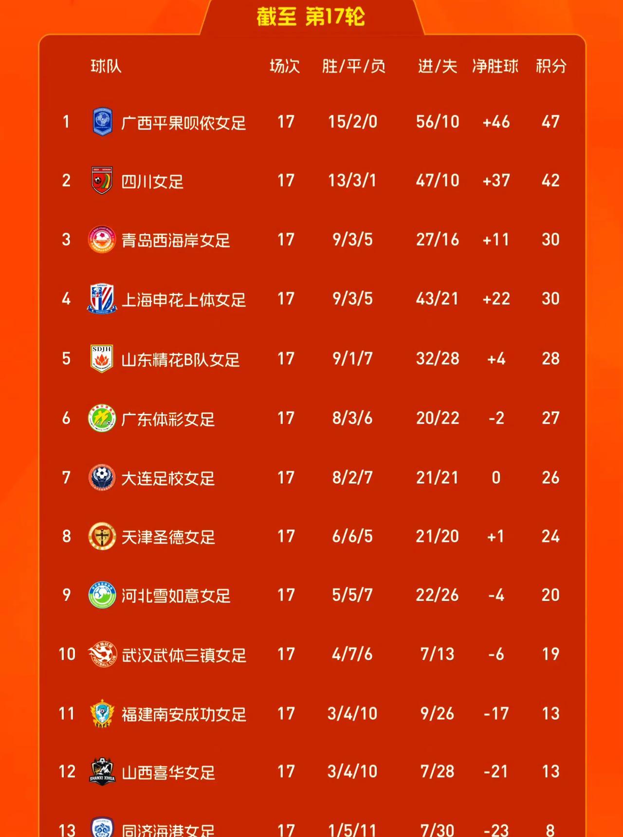 女甲联赛结束第17轮争夺,广西女足、四川女足一直领航,她们晋级女超的路已经确定无
