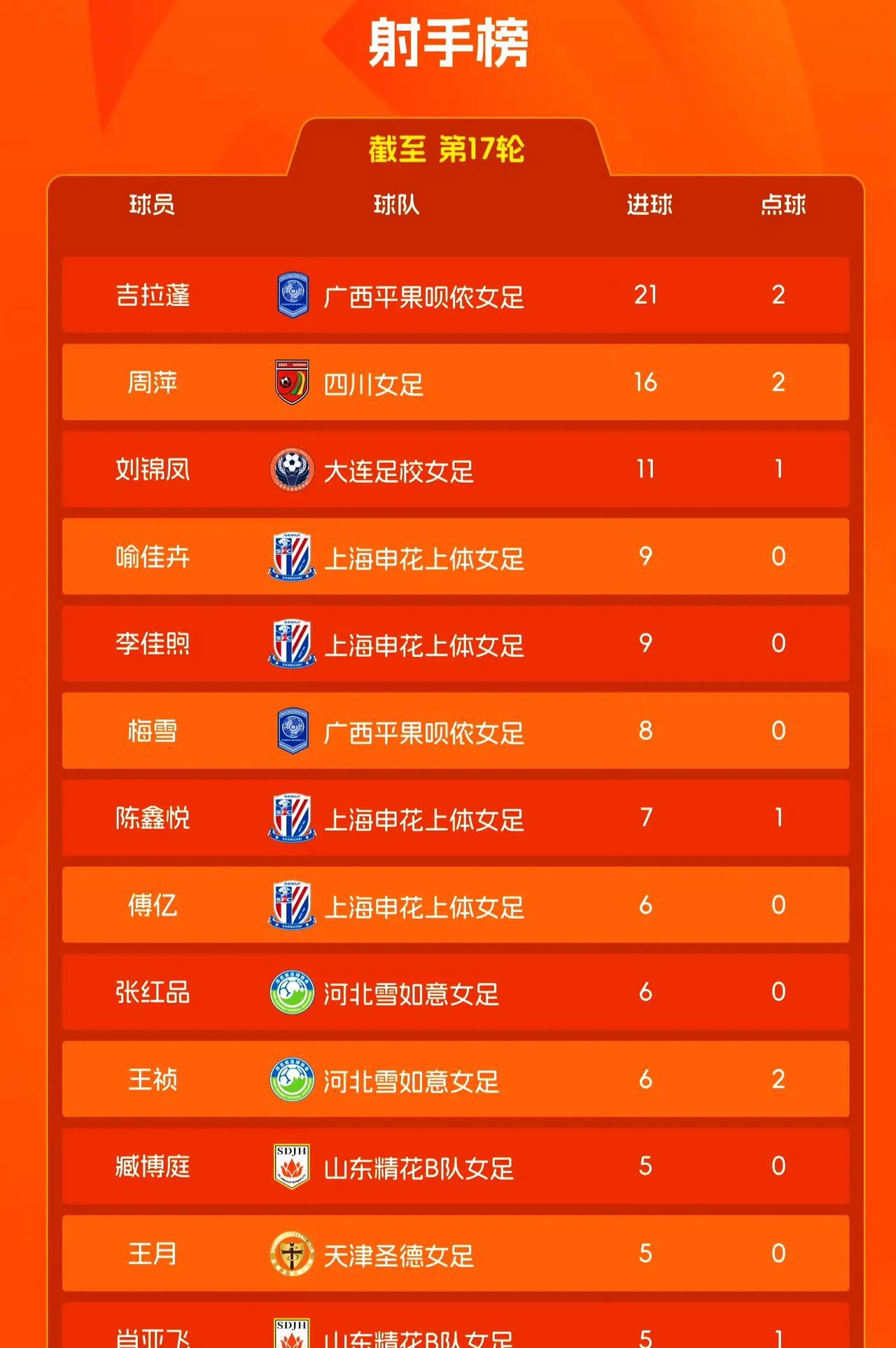 女甲联赛结束第17轮争夺,广西女足、四川女足一直领航,她们晋级女超的路已经确定无人可以阻挡。 截至目前,广西女足积47分雄雄踞榜首,四川女足积42分高居次席,而位列第三、第四的青岛西海岸女足和上海申花女足都只有30分。 那么,青岛西海岸女足、上海申花女足有没有可能后来居上超越广西和四川?很显然,没有这种可能性,要想升超,2026赛季继续在女甲努力吧。 广西女足、四川女足之所以能够自始至终霸凌女甲前二位置,除了她们具备已经为冲超坚持不懈四年的信念与行动,本赛季有两个特别耀眼的点是值得注意的。 看看射手榜,广西女足的外援古拉蓬已经贡献了极其夸张的21球,平均每场进球1.24个,在整个女甲赛场呈现着摧枯拉朽般的传奇。 而1999年出生的年轻前锋周萍,曾经是中国女足国家队U17、U20精英,2021年7月便转会长春女足冲锋陷阵,本赛季为四川女足已经攻破16次对手大门。 这么多年的实践证明,中国女超、女甲,得优秀外援者得冠军,包括曾经风光无限的苏宁女足,包括当下五连冠的武汉女足,外援越来越左右中国女足联赛成绩走向的趋势已经很难改变。 今年的形势也一样,古拉蓬肯定为广西女足锁定女甲冠军奖杯,而女超四强争霸中,唯一全华班的江苏女足能够逆天改命吗? 太难了,哪怕你的主帅是女足世界杯技术科研12人天团之一的陈婉婷,哪怕你的四年青春风暴打造了中国女足国家队的半壁江山,但2025赛季照样染指不了冠军。