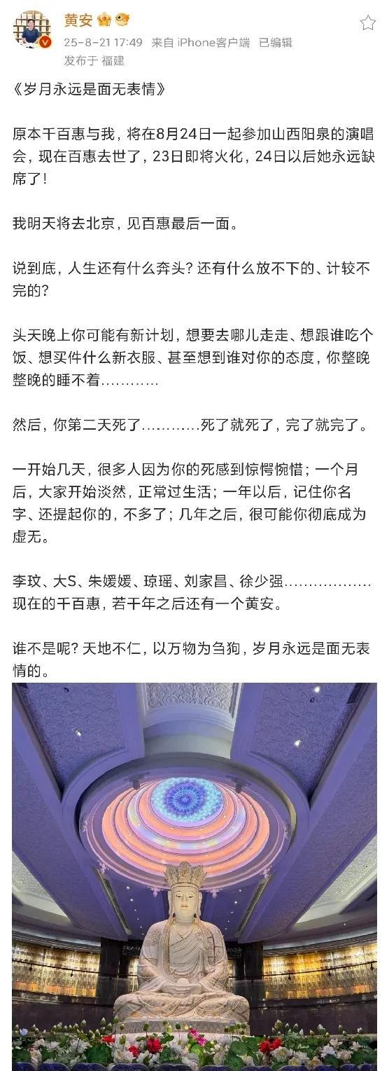 黄安说岁月总是面无表情 8月21日下午,黄安在社交媒体发文,带书名号的标题是《岁月总是面无表情》。 黄安说,原本他和千百惠8月24日一起参加山西阳泉的演唱会,现在百惠去世了,23日即将火化,24日以后她永远缺席了! 黄安要去北京,见她最后一面; 黄安在千百惠去世这件事上,再次感受到了人生的无常,不管做了再多计划,都有可能戛然而止…… 所以黄安又提到了李玟、大S、朱媛媛、琼瑶、刘家昌、徐少强…似乎每一个都是例证。 或许由于与千百惠感情太深,学佛的黄安,让人感觉有一些消极; 其实,古人早就有对人生的思考,所以活在当下,是很多人秉承的人生观吧? 有人说,今朝有酒今朝醉,明日愁来明日愁; 蔡澜说每晚看夜景多妙,派对结束就谢幕; 或许,每个人都是宇宙的尘埃,人生本没有意义; 或许,活过,本身就是一种意义吧……