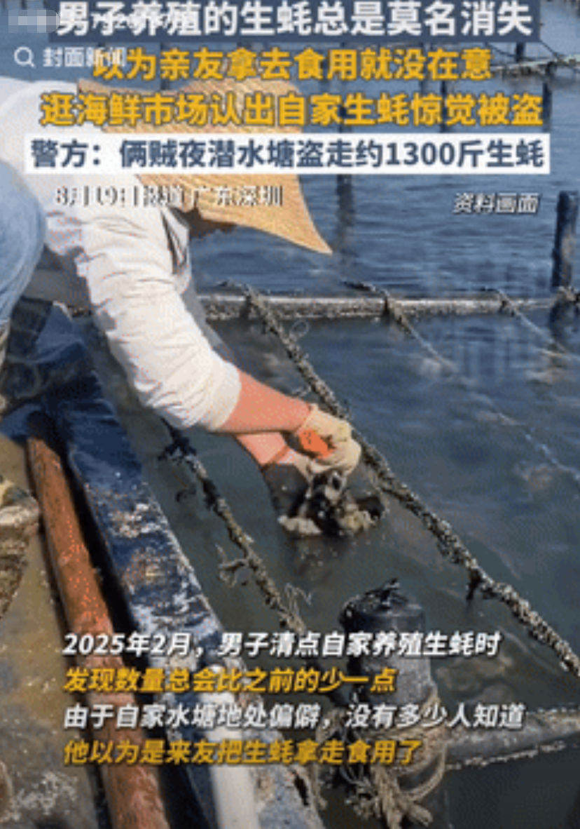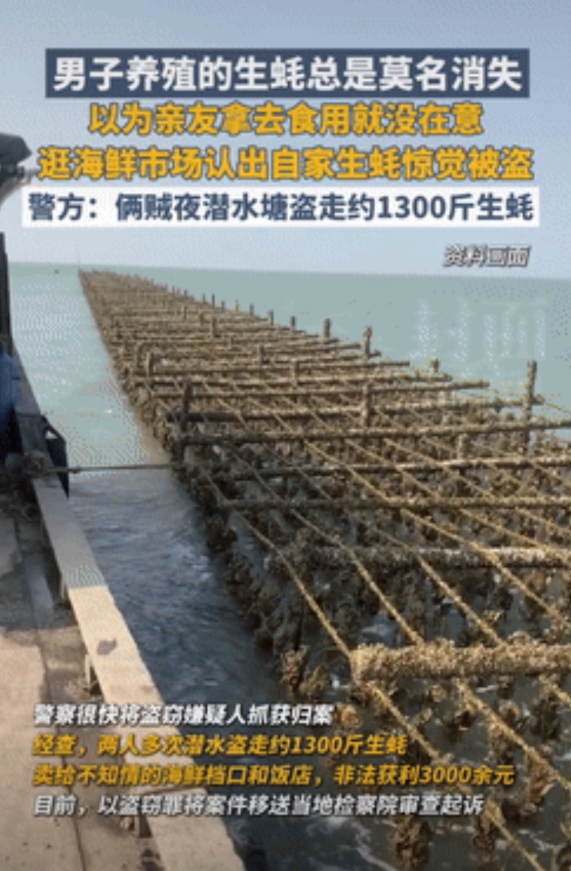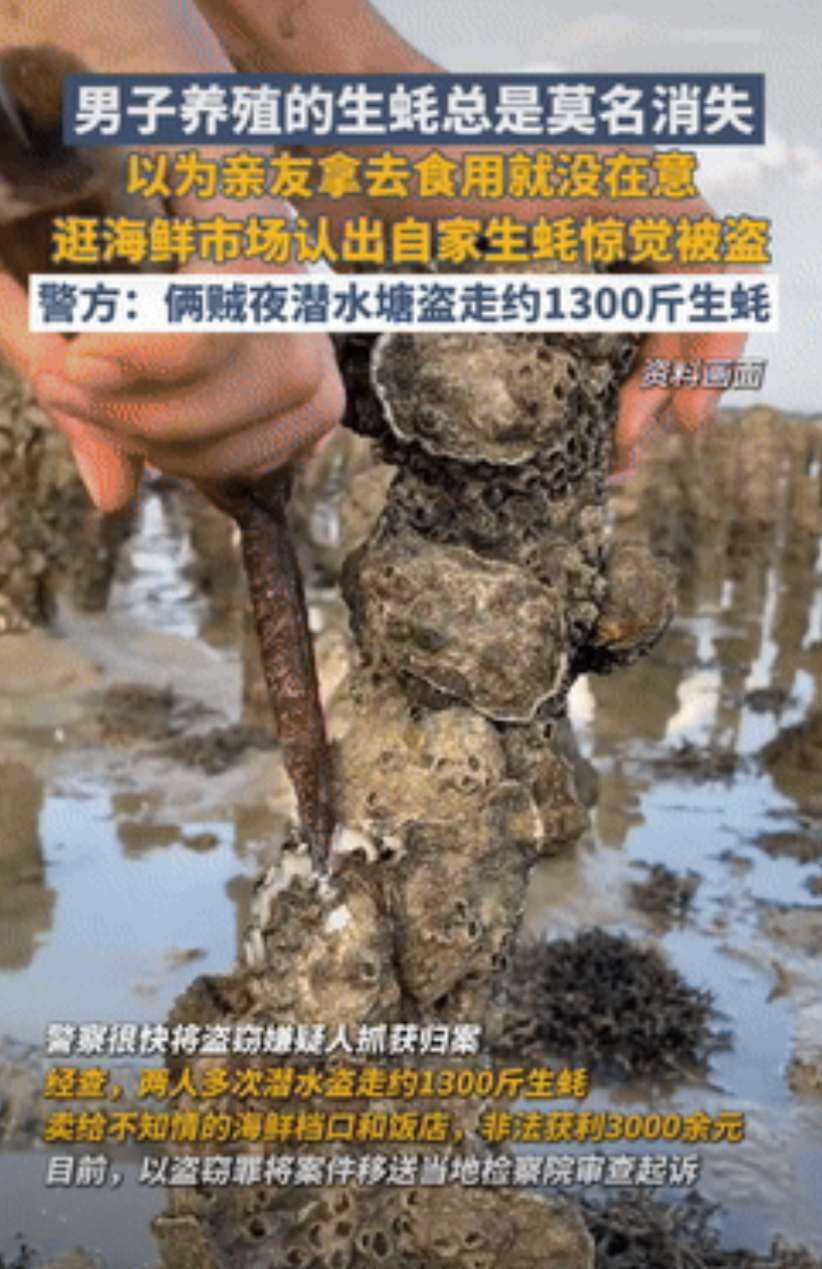 心不是一般的大!广东深圳,一男子养殖的生蚝总是莫名消失,他以为是亲友拿走吃了,就没太在意,不料,在一次逛海鲜市场时,竟发现了自家特有品种的生蚝,这才发觉消失的生蚝,其实是被偷了! 据封面新闻8月21日的报道,事情还要从半年前说起,男子清点自家水塘里的生蚝时,发现数量有些对不上,但只少了一点点。 因为水塘的位置比较偏僻,他就觉得应该是家人过来,拿了一点回去吃了,所以就没有太将其给当回事,即便是后面还发现了这种情况。 直到有次他去家附近的海鲜市场闲逛时,意外看到有人正在售卖,自家所养殖的特有品种的生蚝。 可这个时候明明还不到上市的时间,并且自己也没向外售卖,那么对方的生蚝是哪里来的呢? 就这样,他才醒悟过来“消失的生蚝”,到底是怎么回事,原来是被小偷给光顾了,亏得自己还以为是家人拿的。 随后他急忙去报了警,在经过调查之后,民警就成功抓获两个人,据他们所说,是因看到男子不经常过来打理水塘,觉得偷走一些应该不会被发现,所以在晚上的时候,就带着工具“进货”去了,总共是偷了有1千3百多斤,卖了有3千多。 别的先不说,男子的心是挺大的,丢那么多的东西,丝毫没往被偷上想,还以为是亲戚,但凡问下亲戚就能知道,非得给小偷机会。 那么对于这件事情,您有什么想说的呢?