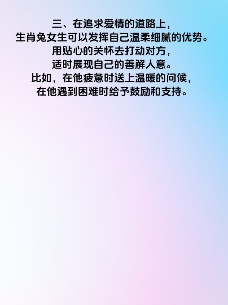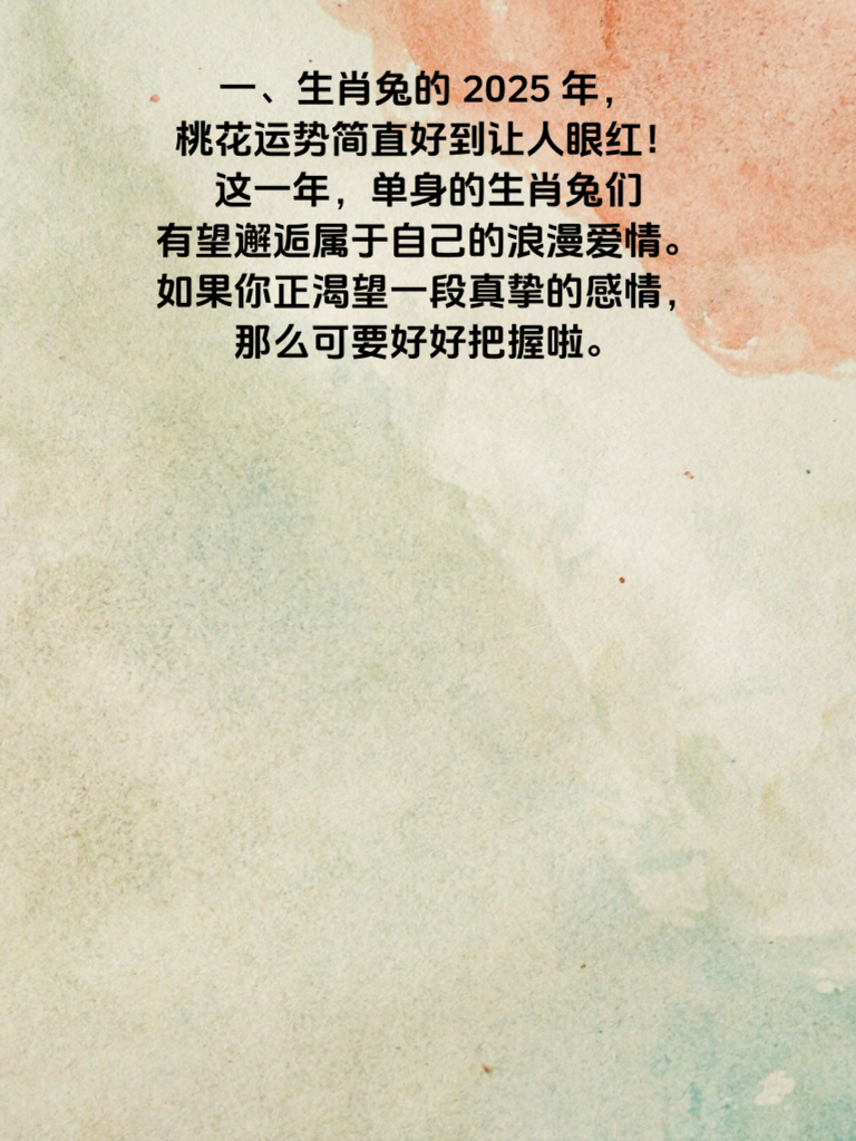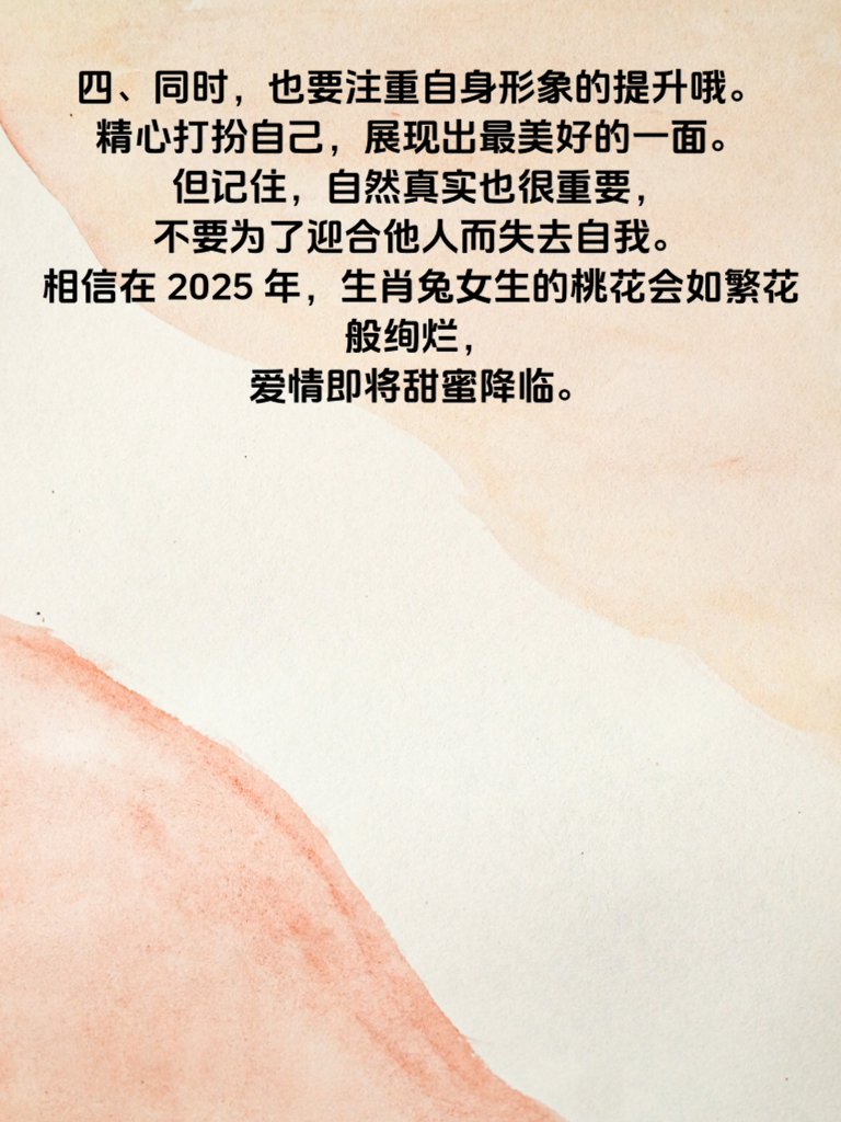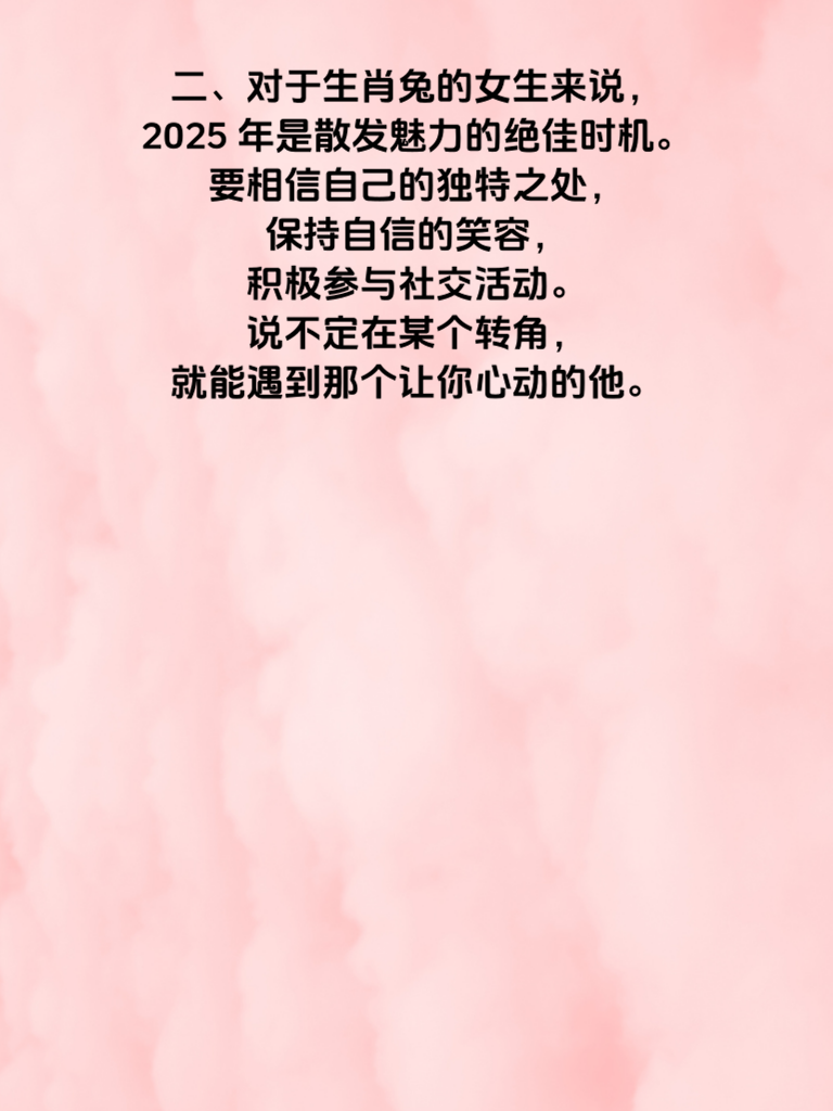 一、生肖兔的2025年,桃花运势简直好到让人眼红!这一年,单身的生肖兔们有望邂逅属于自己的浪漫爱情。如果你正渴望一段真挚的感情,那么可要好好把握啦。 二、对于生肖兔的女生来说,2025年是散发魅力的绝佳时机。要相信自己的独特之处,保持自信的笑容,积极参与社交活动。说不定在某个转角,就能遇到那个让你心动的他。 三、在追求爱情的道路上,生肖兔女生可以发挥自己温柔细腻的优势。用贴心的关怀去打动对方,适时展现自己的善解人意。比如,在他疲惫时送上温暖的问候,在他遇到困难时给予鼓励和支持。 四、同时,也要注重自身形象的提升哦。精心打扮自己,展现出最美好的一面。但记住,自然真实也很重要,不要为了迎合他人而失去自我。相信在2025年,生肖兔女生的桃花会如繁花般绚烂,爱情即将甜蜜降临。