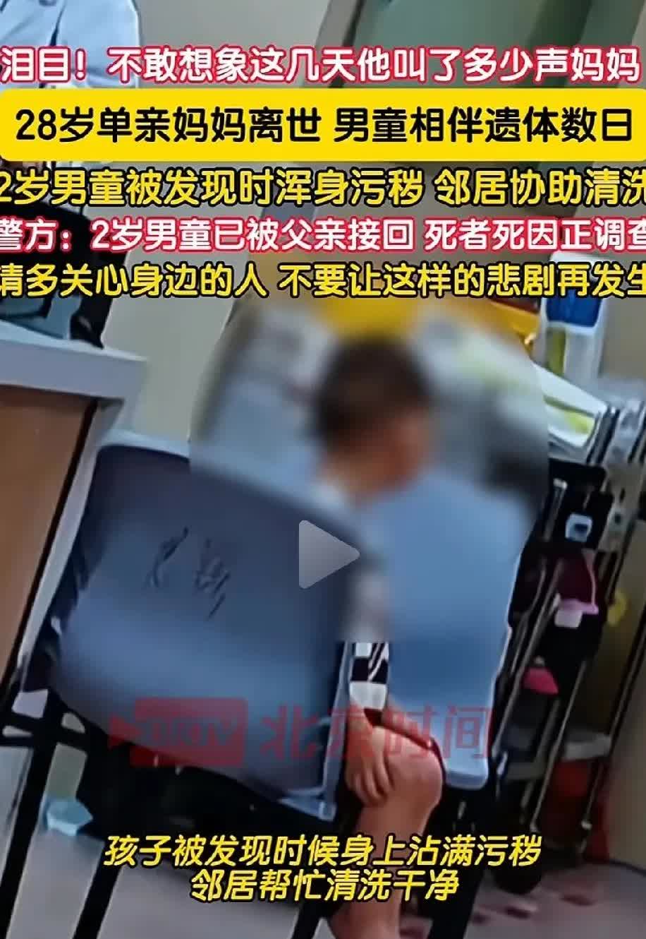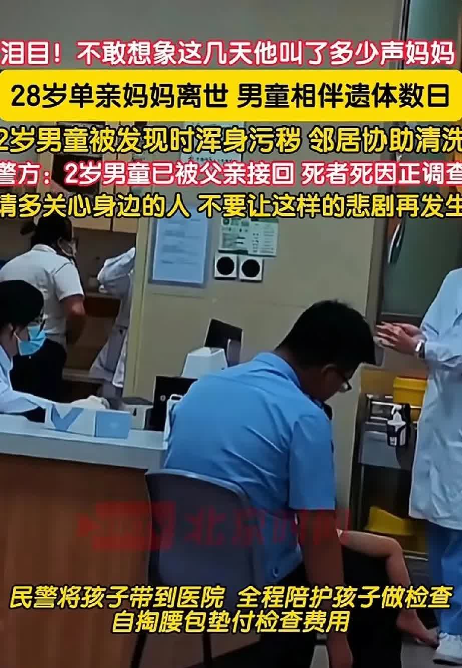 真的不敢想两岁的男孩喊了多少声妈妈?他饿了、渴了、困了,只能一遍遍的喊妈妈。28岁女子家中突然离世,2岁儿子守在身边,他不会说话,不懂生死,不懂离别,只会一遍遍喊着妈妈,他不懂为什么疼他的妈妈,再也不回应他。 要不是邻居闻到臭味,到了男孩家中发现了他,还不知道小男孩多可怜。才只有两岁,还不会穿衣吃饭,更不会求救,满身的屎和尿。 妈妈没了这几天,他是如何吃喝的,大概率满身的屎尿就是他全部的食物。 以前只是在电视电影里渲染悲情的场景,如今在现实中上演,但凡有个亲人和母子打电话,关心一下,也能及时发现。 就连男警察看到孩子,都忍不住泪流,抱起小小的男孩,自掏腰包去医院检查。 他依旧这么安静的坐着,或许这几天他已经习惯这种安静的沉默,也或许他感知到了妈妈的离世,他虽然不懂生死,却过早了接受了生死! 成年人都难以释怀的离别,却早早的让一个只有两岁的男孩被动接受,他在医院里安静的坐着,不哭也不闹,远远超出两岁孩子的天真! 看着他孤单的背影,脚丫子光秃秃的搭着,即便他什么都不做,就足以让人泪奔!从此以后,那个最亲最爱的妈妈,再也没有了!
