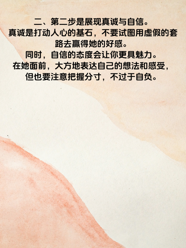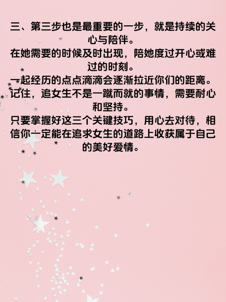 一、追女生的关键技巧,第一步就是要用心去了解她。每个人都有独特的喜好和性格,只有深入了解,才能找到与她沟通的切入点。比如,她喜欢看什么类型的电影,对什么话题感兴趣,这些细节都能成为你们交流的桥梁。 二、第二步是展现真诚与自信。真诚是打动人心的基石,不要试图用虚假的套路去赢得她的好感。同时,自信的态度会让你更具魅力。在她面前,大方地表达自己的想法和感受,但也要注意把握分寸,不过于自负。 三、第三步也是最重要的一步,就是持续的关心与陪伴。在她需要的时候及时出现,陪她度过开心或难过的时刻。一起经历的点点滴滴会逐渐拉近你们的距离。记住,追女生不是一蹴而就的事情,需要耐心和坚持。只要掌握好这三个关键技巧,用心去对待,相信你一定能在追求女生的道路上收获属于自己的美好爱情。
