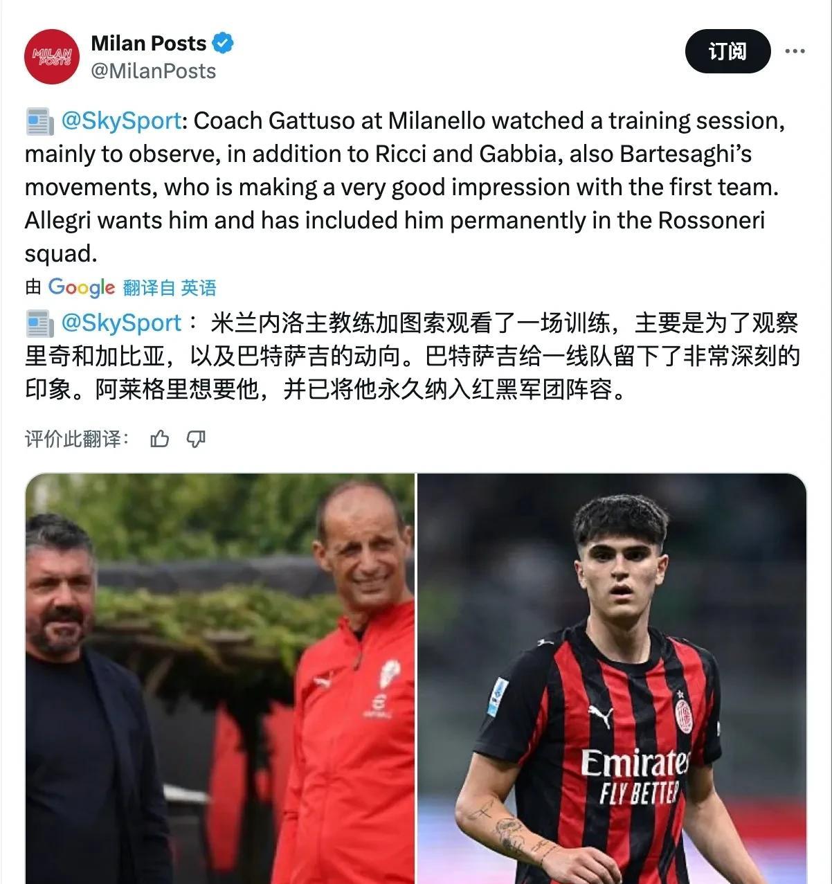 阿莱格里为加图索推荐巴特萨吉。阿莱格里告诉加图索巴特萨吉是一名十分优秀的球员,他的未来会在米兰一线队获得更多的机会,希望加图索在考察加比亚与里奇的同时,也要多关注巴特萨吉的成长。另外找到一张旧图,满满的回忆感! 昨天就看到加图索来米兰,加图索走在前面很多工作人员跟着,估计工作人员也清楚,在米兰这一亩三分地加图索不需要任何人导引,他比任何人都熟悉米兰。加图索与米兰的多位球员沟通,主要沟通目标是曾经的爱将穆萨,加图索声情并茂的和穆萨说了半天,穆萨一直在笑,估计是没听懂。穆萨从边锋改打中场就是加图索改造的,估计加图索是对穆萨在中场的一些技术动作给予指导。 关于咱们的球员加比亚与里奇,没啥好说的意大利国家队需要这样的球员,他们都很优秀,相信他们也愿意为加图索拼命,至于说巴特萨吉,只是个人想法,巴特萨吉作为边后卫太慢了,也许是身高的原因,看着他就感觉慢,如果巴特萨吉不转型一直都打边后卫,个人觉得可能很难有大的发展。