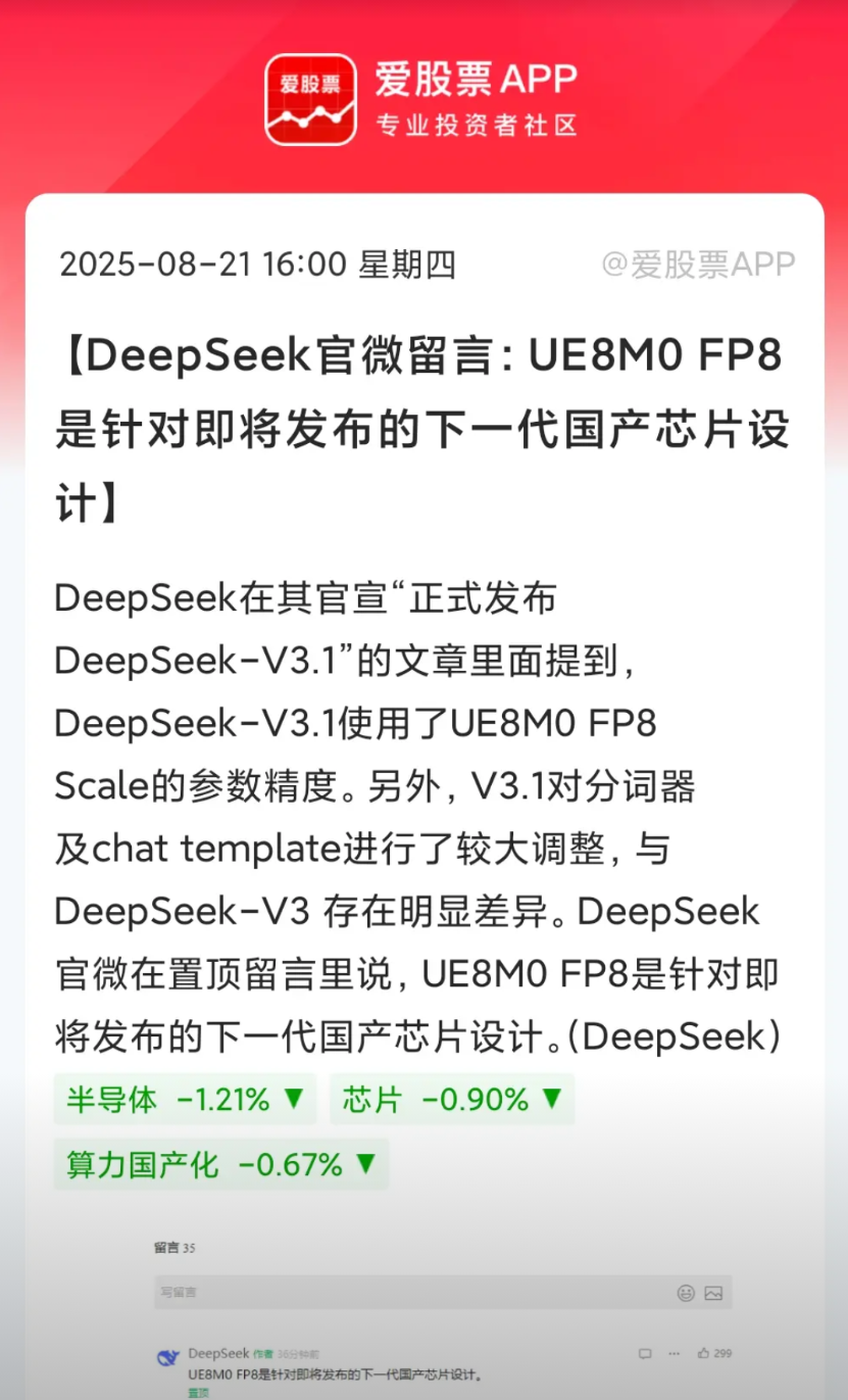 DeepSeek终于还是没憋住,发布新版本了! 虽然不是大家期待的R2,但这个3.1的版本,仍然给市场带来了一些小惊喜。 更大的惊喜是,DeepSeek透露下一代国产芯片即将发布!看来要替代英伟达用国产了,估计主要还是用华为的,昇腾910D有望担当重任。 这也给寒武纪带来更大的空间,难怪最近被爆炒,股价超过1000元,市值超过4000亿元。接下来3年时间,字节、腾讯、阿里等国内巨头如果全面拥抱购买国产芯片,这是一个千亿的市场。但真的能替代英伟达么,可能没想象中那么乐观。