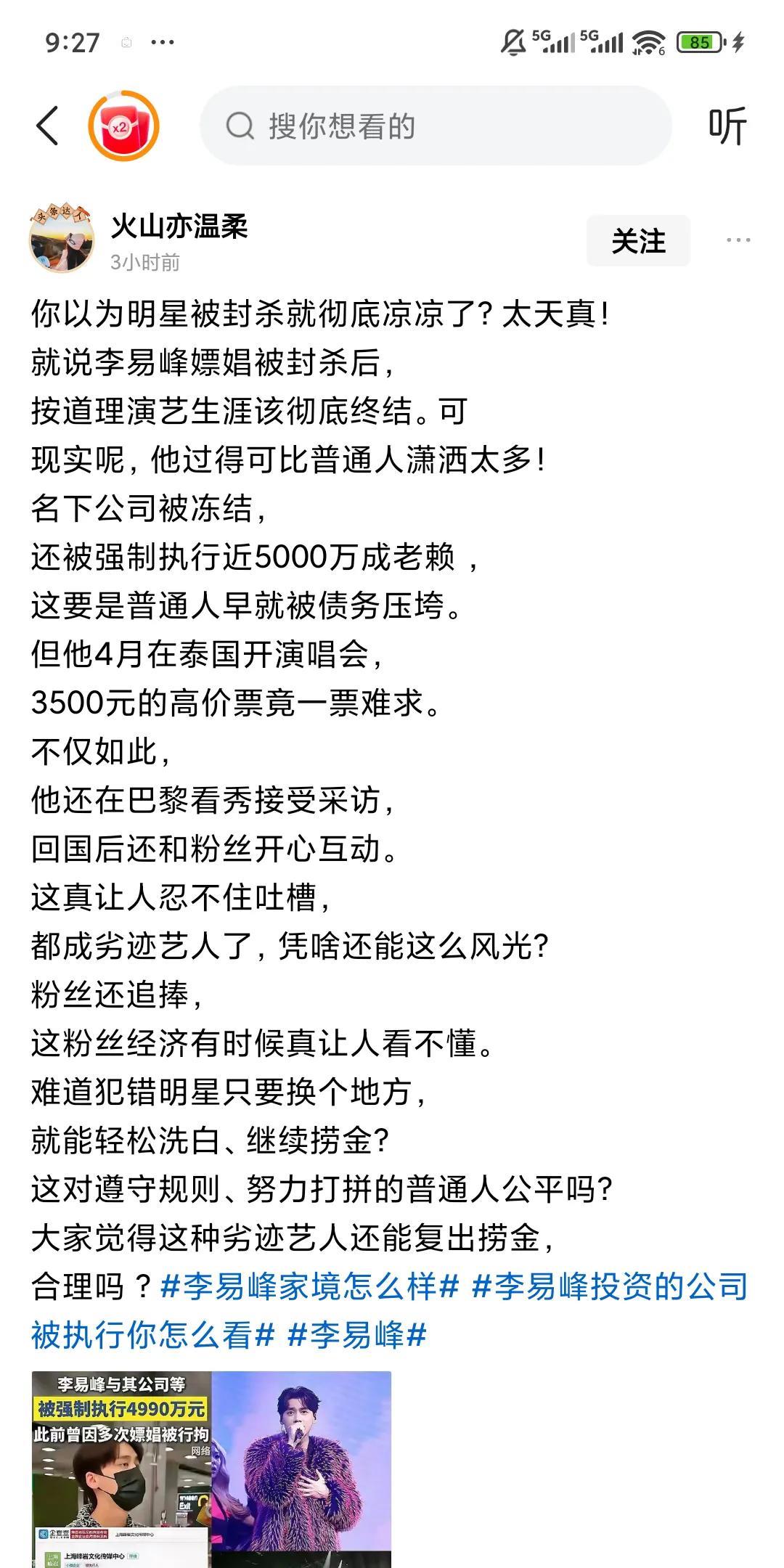 李易峰绝对要哭了! 同样的高颜值,李易峰是因为多次嫖娼而塌房的,罗志祥则是长期出轨和多人运动塌房的....... 作为塌房的李易峰,4月才在泰国开完演唱会,没成想钱包都没捂热就要被执行4990万,虽然李易峰在泰国的票价高达3550,可也耐不住这样子罚,毕竟他赚钱的路子越来越少了。 与此同时,李易峰又被多次提到嫖娼,反复被鞭尸呀,李易峰绝对要哭了,他当初还不如好好找对象,毕竟对他而言很好找,可如今一切都毁了,李易峰现在很后悔了吧! 大家对此怎么看呢?