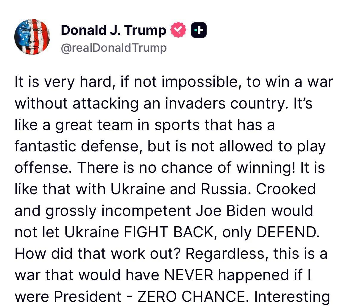 视频中公司技术部门介绍,该导弹射程可达3000公里,落点精度14米。“火烈鸟”FP-5是世界上最大的此类导弹之一,有效载荷高达1150公斤。 目前产能为每天生产一枚。到十月份,他们计划将生产能力提高到每天七枚。 而川普此刻发文,强调“如果不攻击入侵者的国家,要赢得一场战争是非常困难,甚至是不可能的。这就像一支体育比赛中的顶级球队,防守极佳,但却不允许进攻。那是毫无胜算的!” - 这意味着川普已放行远程导弹对俄罗斯本土的进攻。