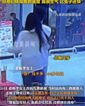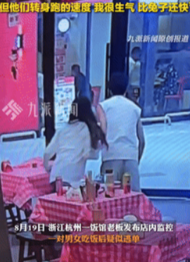 真是活不起了!浙江杭州,一对男女为100多元的餐费,竟趁着店员没注意时,偷偷的逃走了,老板直言:跑的速度比兔子都快,绝对就是故意的,因很难找到这俩人,老板无奈选择发视频曝光,网友:一个被窝里睡不出两种人! 据九派新闻8月21日的报道,当时店里面的人并不多,就只有三四桌的客人,而老板还在店里面待着。 如果没什么意外的话,像逃单的事情应该是不会发生的,毕竟老板第一时间就能发现,可不巧的是,那时店里接了几个外卖订单,看到员工都在忙,老板就去后厨帮忙装个米饭。 而她离开也就只有两分钟,可在她重新回到前面时,却发现那一对男女不见了,至于饭钱自然是没付的。 本来她还想着,这俩人都是年轻人,在素质这一块肯定是要高一些的,但事情总是那么出人意料。 当从监控里看到俩人逃跑的全过程时,老板就觉得很生气,因为他俩的样子看起来,完全不像是忘记给钱的,绝对就是故意而为之的。 因为饭店在居民区的附近,老板还不是本地人,是从外地过来开店做生意的,所以并没有多少人脉,不太好找到那对男女。 所以在无奈之下,只好将监控视频发在网上进行曝光,希望能过这种方式,能够找到他俩,虽说饭钱并不多,但挣得就是那口气,毕竟他们的行为,实在是太气人了。 那么对于这件事情,您有什么想说的呢?