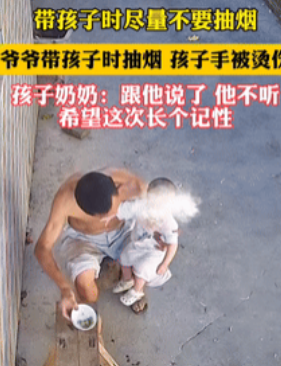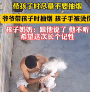 太无语了!广东,一老人照顾孙子时,烟瘾犯了,一边抱着孩子一边抽,不料,在孩子闹腾时,手不慎碰到烟头被烫伤,当场就哭了起来,而奶奶说的一番话,让人生气! 据江西民生广播8月20日的报道,当时刚好是吃饭的时间,老人先是让孩子坐在腿上,开始给他喂饭吃。 过程中,他就有些忍不住,从兜里掏出来烟放进嘴里点上,随后一边抽着烟,一边喂饭给孩子吃。 可没想到,喂完后给孩子擦嘴时,却发生了意外,孩子被弄的有些难受,试图把老人的手给推开,结果就碰到了烟头。 这一下直接把孩子给烫哭了,老人急忙用毛巾扫去孩子手上的烟灰,接着就开始安抚起孩子。 而孩子的奶奶也说了,以前就和他说过,照顾孩子的时候不要抽烟,可他就是死活都听不进去,看看这一次能不能让他改掉吧。 不得不说,这位家长做的确实不到位,吸烟危害健康,而二手烟也一样,自己在那抽一抽就算了,小孩子在旁边还这样,完全是不把孩子的健康当回事。 就这,在孩子被烫到的时候,他还不舍得把烟给丢掉,感觉在他的心里,那烟都比孩子都重要,不然也不会这样。 有网友看完后就表示,孩子还那么小,心肺功能都没发育好,还当着他的面抽烟,这是嫌孩子的身体太健康了吗? 那么对于这件事情,您有什么想说的呢?