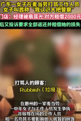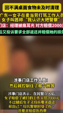真把自己当上帝了!广东惠州,一女子因不满桌面食物没及时清理,在快餐店里打骂店员,扇了对方一巴掌,报警后赔了2千元,不料,事后女子又去投诉,要求把钱还回来,甚至还要赔偿她的损失!网友:终究是和谐社会救了她! 据南昌晚报8月21日的报道,女子去快餐店吃东西,当时店里的客人可能有些多,保洁员没来得把其他顾客吃剩的食物清理走。 而这一幕就引起女子的强烈不满,骂完保洁完后,跑到前台就要投诉,全程说话的声音还很大,已经影响到其他来吃东西的顾客。 于是店员就出声提醒,可没想到,女子却火力全开把矛头指向了店员,又是说脏话又是飙英文的。 在发生冲突的时候,门店经理听到动静赶了过来,想要从中劝和,甚至还有位顾客也加入其中。 值得一提的是,过程中她还在叫嚣,说自己认识很多警察,也不知道想表达什么意思,彰显自己的实力? 然而,好心顾客也遭到女子的辱骂,而经理还被她扇了个耳光,无奈之下,只好选择报警求助,最终女子赔了2千块。 本以为事情到此就完了,谁知事后女子又打电话投诉,想要赔的钱要回来,更甚至,还要让门店赔她钱。 而理由就是她受伤了,不过这个伤,其实是民警赶来处理时,见到女子还在撒泼打滚,出手制止她的时候,她自己反抗造成的,如今警方还在调查中