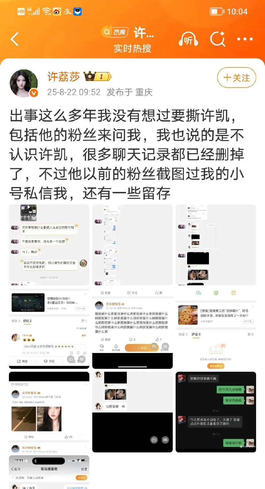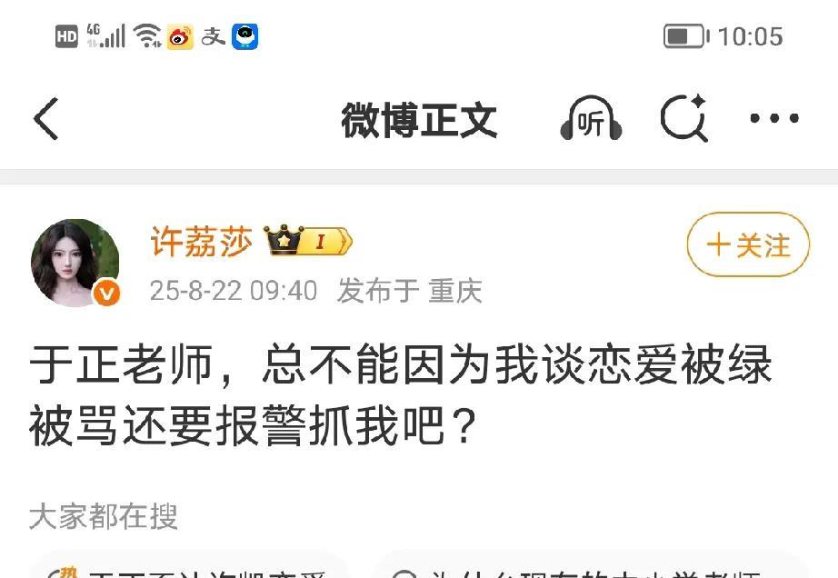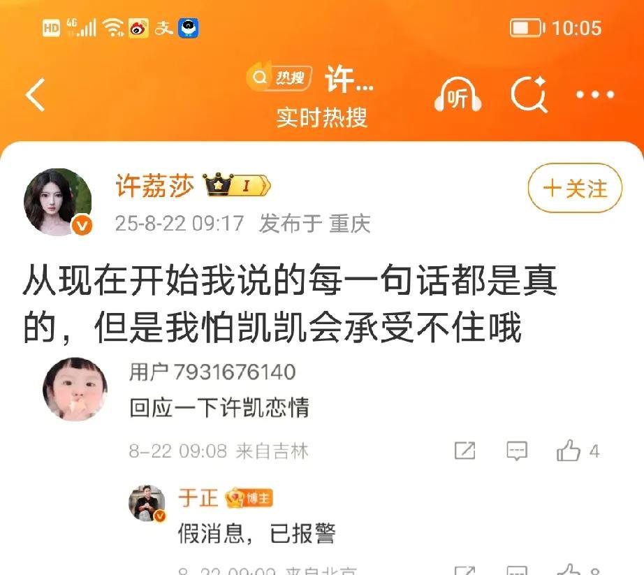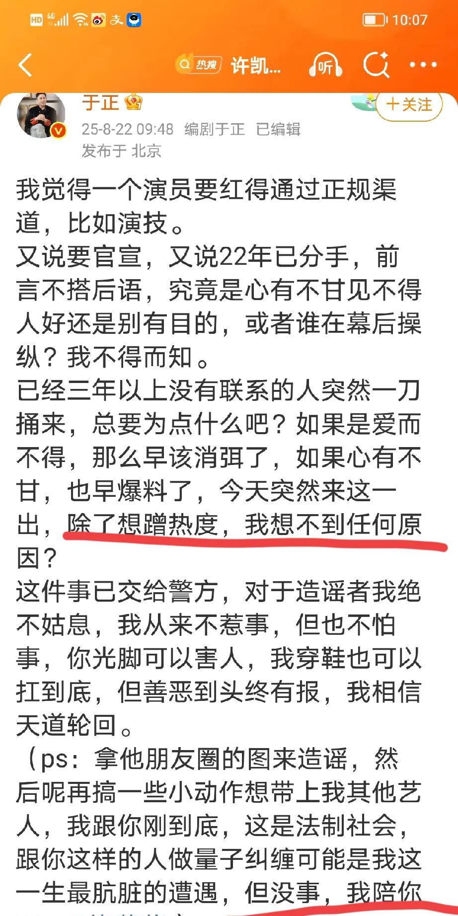 于正关于许荔莎爆料许凯和赵晴的事,发表了最新回应,表示要追究到底。 于正的意思就是曾经谈过恋爱,但是已经分开三年了,早不爆晚不爆,为什么现在这个时候爆料,除了想红就是有幕后操纵。 看见许荔莎18号的时候还曾经点赞过许凯的新剧宣传《子夜归》,应该不是彻底闹掰的情况啊。 大家分析分析这是为什么?