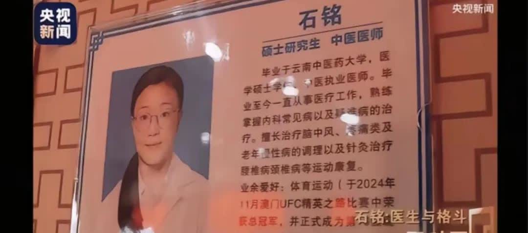 看看中国现在非常火的拳击女运动员石铭,个人履历绝对会让人大吃一惊! ①石铭,1994年11月出生在黑龙江齐齐哈尔。爷爷奶奶都是当地的老中医。父亲则是一位武术爱好者。从小她都对武术非常着迷。 ②石铭,10岁开始练习武术。练过跆拳道,散打,摔跤,但这些只是她的业余爱好。平时大部分时间还在学习文化知识。 ③功夫不负有心人,2013年17岁的石铭考入云南中医药大学。毕业之后也进入了一家中医院工作。不过不满足日复一日一日,比较乏味的医生工作。空闲时间偷偷的瞒着父母,跟著名教练巴格学习擒锁式摔跤。不鸣则以一鸣惊人。还参加过几次武林风的比赛。都赢了。 ④2024年,30岁的石铭参加了UFC格斗系列赛。不鸣则已,一鸣惊人。一举拿下了ufc草量级的冠军。优异的表现也拿到了UFC合同。 ⑤2025年8月22号。石铭向医院请了6天假。将会去上海体育馆参加UFC终极格斗冠军赛,期待她有优异的表现。希望上海的父老乡亲们不要去看那个什么时代团体演唱会。还不如去看石铭的比赛,观赏性更高。 石铭这位来自东北的女汉子。一路走来都非常不容易。毕竟人家的主业是医生。只有空闲时间才有空去锻炼,比赛。 石铭:机会从来不是别人给的,而是我自己争取来的[赞]