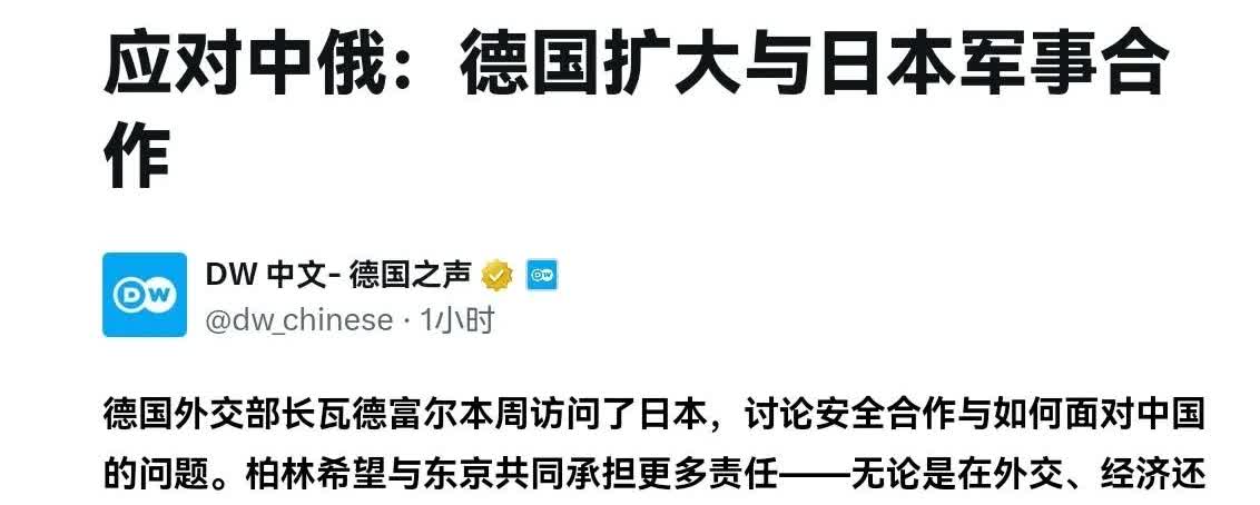德国已经在实质性降低对华合作关系了!8月21日,在德国外交部长瓦德富尔本周访问了日本之后,德媒表示,当德国外交部长瓦德富尔在日本横须贺军事基地的军舰前谈论中国的强势地位时,他知道这样的画面会在哪里受到特别的审视。德媒表示,德国外长的表态正在激怒中国,但德国外长并没有改口,德国外长反而称日本是德国在亚洲的首要合作伙伴。 除了这种口头的表态不算,柏林还希望与东京共同承担更多责任——无论是在外交、经济,还是军事上。德国方面也希望学习日本经验,减少对中国的依赖,而包括与印尼的合作,也是德国认为最风险化战略的重要组成部分。很显然,从德国外长对我们大放厥词,到德日甚至包括军事层面的合作都在升级,并称日本是德国在亚洲的首要合作伙伴,这都代表德国对华态度的巨大转变。 这种转变是什么呢?那就是中德之间的实质性合作正在降级,而德国表现出了与我们越来越强的对抗色彩。很显然,德国外长的大放厥词,这不是该政客的临时起意,而是德国对华政策转向的鲜明标志。从高度重视对华关系到转变到重视对日关系,这极有可能预示着,在政治上,中德越来越难以合作。 在经贸上,中德将会有越来越多的摩擦和竞争,在军事上,德国极有可能加强在南海,台海的存在,对我们进行挑衅。当然,从我们的角度而言,既然德国错误的展现出来了将其面临的挑战归因于我们的倾向,更多的把我们视为“威胁”,那我们恐怕也不得不出手捍卫我们自身的利益。很显然,德国发出的信号对我们正越来越不友善,我们也要为中德关系的转变做好准备。