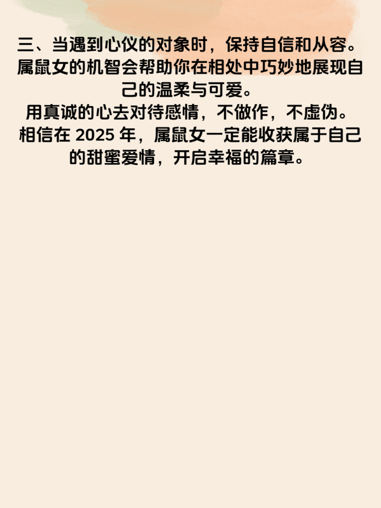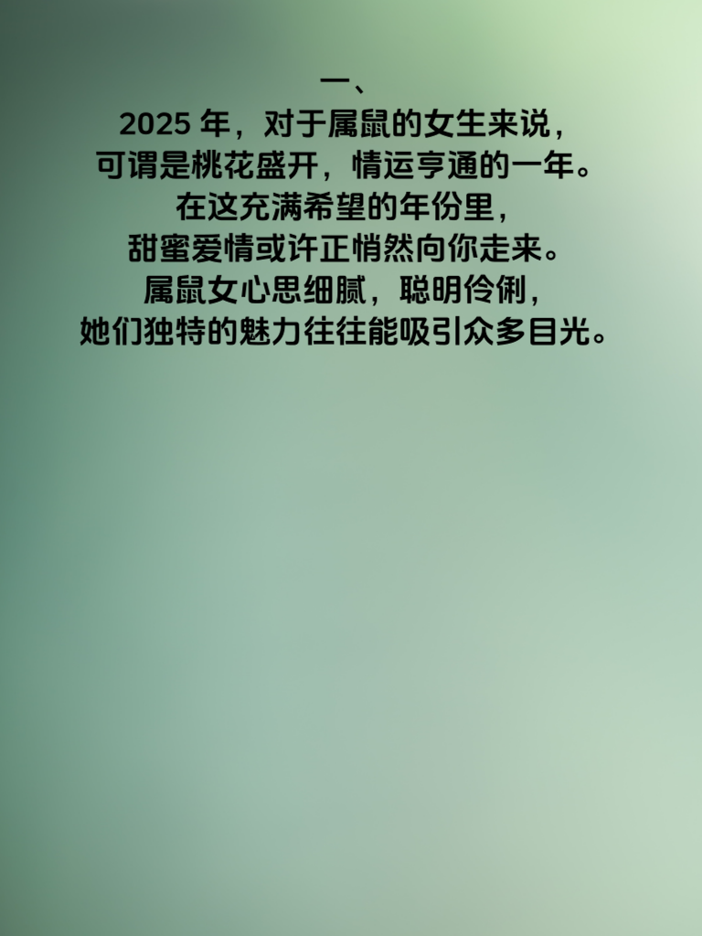 一、2025年,对于属鼠的女生来说,可谓是桃花盛开,情运亨通的一年。在这充满希望的年份里,甜蜜爱情或许正悄然向你走来。属鼠女心思细腻,聪明伶俐,她们独特的魅力往往能吸引众多目光。 二、在这一年,要积极拓展自己的社交圈子。参加各种兴趣活动,无论是文艺聚会还是户外运动,都可能让你结识到那个特别的他。主动展现自己的优点,真诚地与人交流,不要害怕表达自己的想法和感受。 三、当遇到心仪的对象时,保持自信和从容。属鼠女的机智会帮助你在相处中巧妙地展现自己的温柔与可爱。用真诚的心去对待感情,不做作,不虚伪。相信在2025年,属鼠女一定能收获属于自己的甜蜜爱情,开启幸福的篇章。