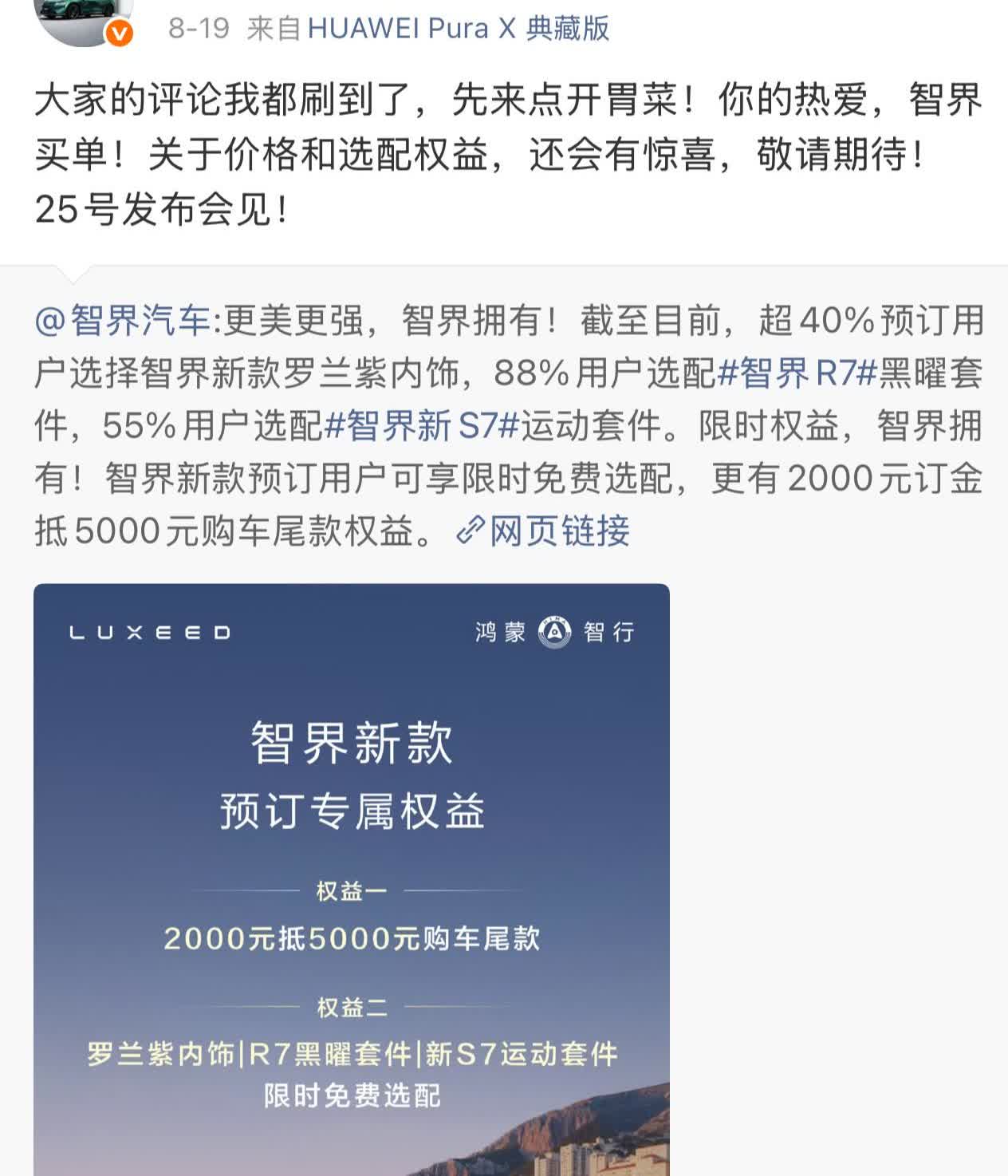 智界海蓝天,海总说了:大家的评论我都刷到了,先来点开胃菜!你的热爱,智界买单!关于价格和选配权益,还会有惊喜,敬请期待!25号发布会见!期待惊喜,如果27.8万Max+送个科技包+外观内饰来个1.2万限免,那就不卖爆都不行了[耶][耶][耶]期待发布会,期待早日交付上市……