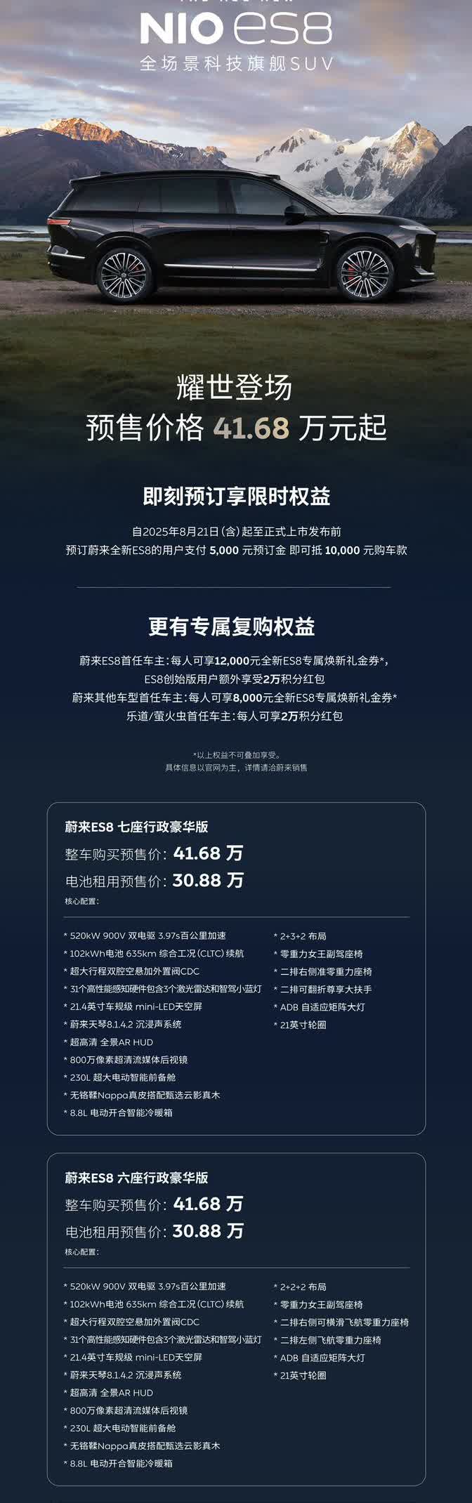 全新ES8预售发布,整车购买价预售41.68万元起,电池租用方案预售30.88万