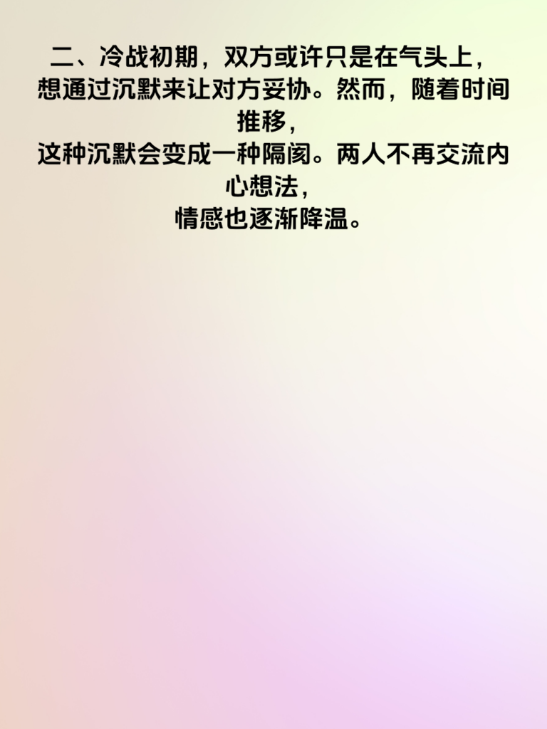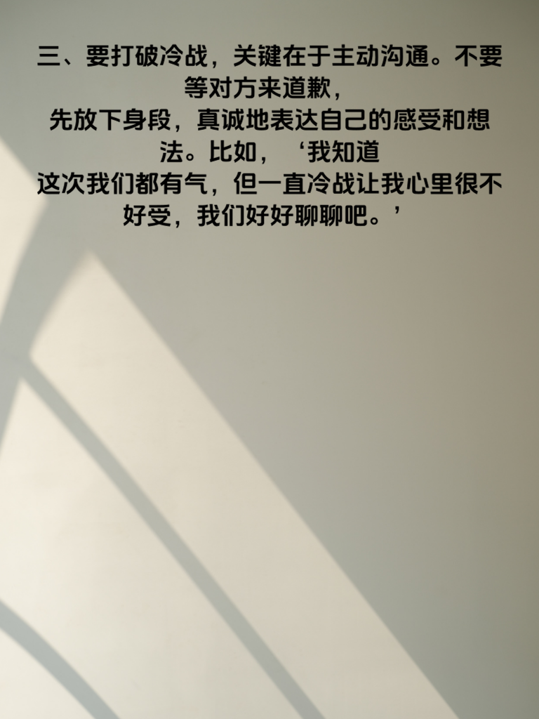 一、婚后冷战超过3天,婚姻亮起红灯。冷战,是婚姻中的无声炸弹,每一次的沉默,都在侵蚀着夫妻间的情感纽带。当冷战超过3天,问题已不再是简单的意见不合,而是婚姻开始出现裂痕的信号。 二、冷战初期,双方或许只是在气头上,想通过沉默来让对方妥协。然而,随着时间推移,这种沉默会变成一种隔阂。两人不再交流内心想法,情感也逐渐降温。 三、要打破冷战,关键在于主动沟通。不要等对方来道歉,先放下身段,真诚地表达自己的感受和想法。比如,‘我知道这次我们都有气,但一直冷战让我心里很不好受,我们好好聊聊吧。’ 四、同时,倾听对方也很重要。给对方充分表达的机会,不要急于反驳。只有真正理解对方的想法,才能找到解决问题的关键,让婚姻重回温暖。