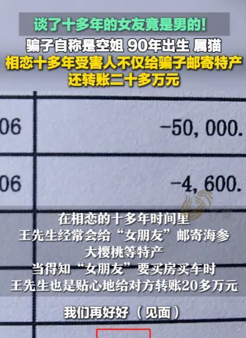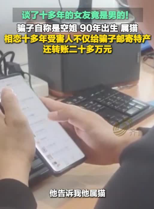 “太荒唐了!”2025年4月,山东烟台,男子发现自己谈了十多年的女友竟然是男的,骗子自称90年出生属猫,男子还傻傻给“女友”转账20多万,网友:“就属猫这一点,20多万就当是交学费了!” 2025年4月份,山东烟台有个大哥,在网上谈了十多年的恋爱,结果最后发现,自己心心念念的“女朋友”竟然是个男的。这十多年里,他给这位“女友”转了20多万块钱呢。直到对方突然联系不上了,报了警才知道真相。 事情得从2012年说起,那时候王大哥在一个婚恋网站上注册了个账号,想找个对象。后来他看到一个叫“欧阳思雨”的女孩子,说是国航的乘务长,90后,长得挺漂亮,说话也温柔。王大哥鼓起勇气加了她好友,没想到很快就得到了回应。两人越聊越投机,很快就确定了恋爱关系。 这一谈就是十多年。王大哥对“欧阳思雨”特别好,逢年过节就送礼物,对方一说有困难,立马就转账。十几年下来,他给“欧阳思雨”转了20多万呢。他也多次提出见面,但都被对方用各种理由拒绝了,比如工作太忙、家人不同意等等。虽然一次面都没见过,但王大哥一直深信不疑。到了2025年3月份,“女友”突然间没了消息。王先生急坏了,赶紧报了警。警察一查,原来这个叫“欧阳思雨”的根本就是个男的,他不仅装女的骗人,还有真正的女朋友呢。这下,他的谎话全露馅了。 现在,骗子已经被警察抓起来了,等着法律好好收拾他呢。这场假恋爱一谈就是十多年,结果王先生被骗了二十多万元。网友们都说:“就为这眼光,这学费交得可真够贵的。”