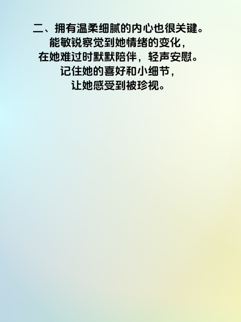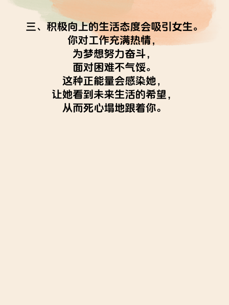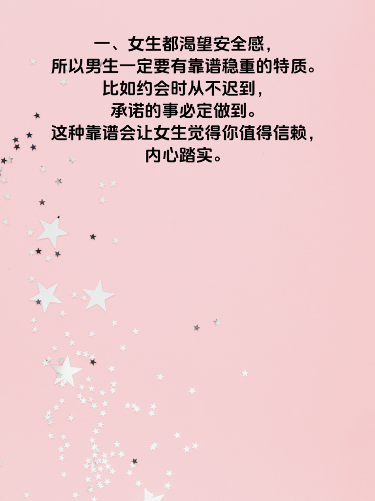 一、女生都渴望安全感,所以男生一定要有靠谱稳重的特质。比如约会时从不迟到,承诺的事必定做到。这种靠谱会让女生觉得你值得信赖,内心踏实。 二、拥有温柔细腻的内心也很关键。能敏锐察觉到她情绪的变化,在她难过时默默陪伴,轻声安慰。记住她的喜好和小细节,让她感受到被珍视。 三、积极向上的生活态度会吸引女生。你对工作充满热情,为梦想努力奋斗,面对困难不气馁。这种正能量会感染她,让她看到未来生活的希望,从而死心塌地跟着你。