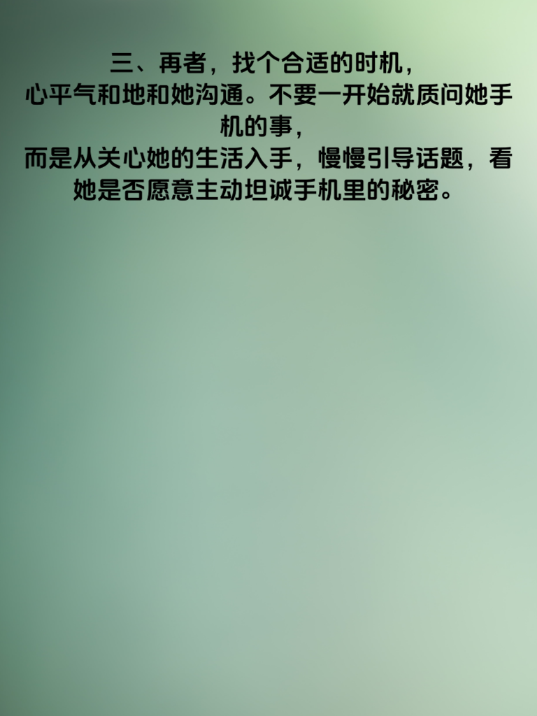 一、当发现她手机藏着秘密,那种不安的感觉如影随形。其实,先别急着下出轨的定论。很多时候,手机里的秘密不一定就指向背叛。也许她只是有些小情绪,不想立刻被你知晓。 二、首先,观察她日常的行为变化。如果她突然变得比以前更注重隐私,接电话或回信息时总是避开你,那确实值得留意。但这也不绝对意味着出轨,有可能是工作上的敏感事务。 三、再者,找个合适的时机,心平气和地和她沟通。不要一开始就质问她手机的事,而是从关心她的生活入手,慢慢引导话题,看她是否愿意主动坦诚手机里的秘密。 四、若她始终遮遮掩掩,也别一味地猜疑。可以试着回忆你们相处的点滴,看看是否近期有什么矛盾或压力导致她有这样的举动。也许解决了根源问题,手机秘密也就不再是秘密了。 五、记住,在感情里,信任是基础,但适当的谨慎也是必要的。用正确的方式去探寻真相,而不是盲目地认定她出轨,这样才能更好地维护你们的感情。