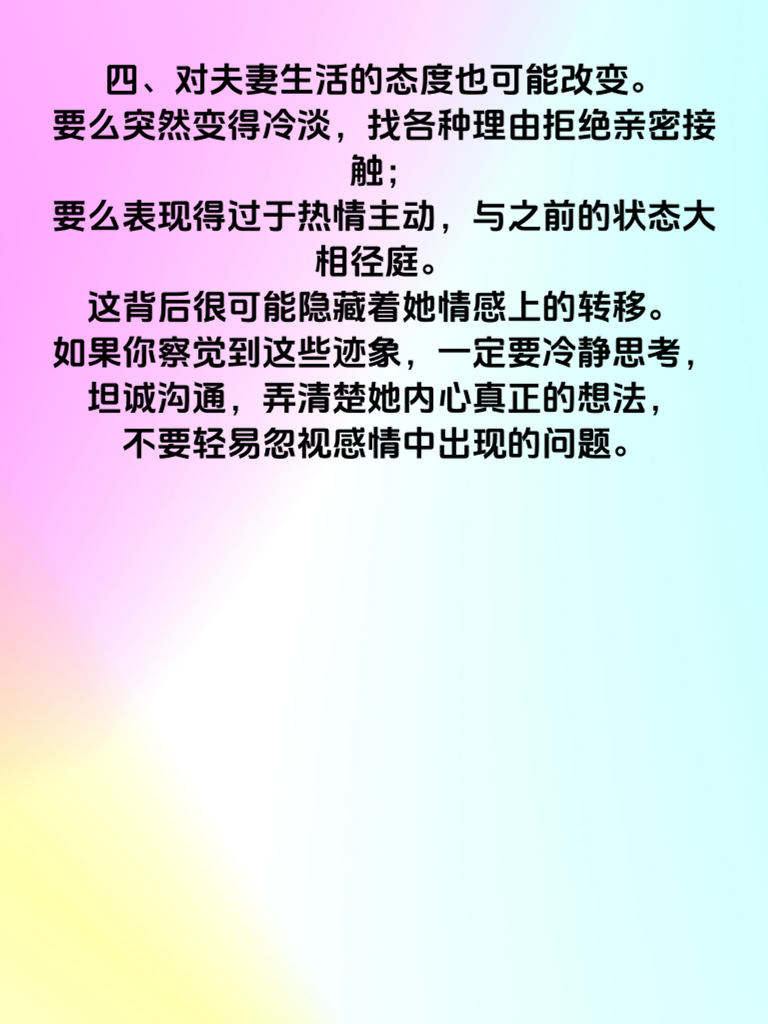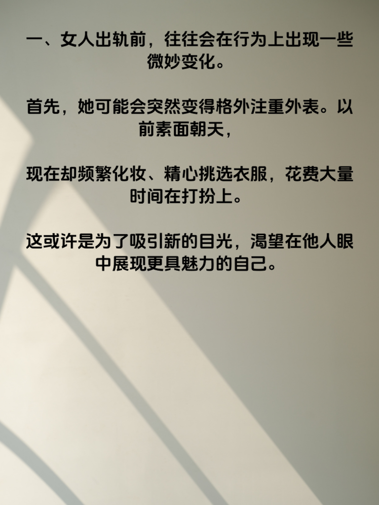 一、女人出轨前,往往会在行为上出现一些微妙变化。首先,她可能会突然变得格外注重外表。以前素面朝天,现在却频繁化妆、精心挑选衣服,花费大量时间在打扮上。这或许是为了吸引新的目光,渴望在他人眼中展现更具魅力的自己。 二、日常交流也会有所不同。她开始变得不耐烦,对你的关心和问候不再像以往那般回应热情。聊天时总是敷衍了事,甚至经常找借口避开与你深入交流,似乎在刻意隐藏什么。 三、时间分配上也会有迹可循。她会莫名地忙碌起来,频繁有外出活动,而且常常很晚才回家。对于自己的行踪,不再像以前那样对你坦诚相告,总是含糊其辞,让人捉摸不透。 四、对夫妻生活的态度也可能改变。要么突然变得冷淡,找各种理由拒绝亲密接触;要么表现得过于热情主动,与之前的状态大相径庭。这背后很可能隐藏着她情感上的转移。如果你察觉到这些迹象,一定要冷静思考,坦诚沟通,弄清楚她内心真正的想法,不要轻易忽视感情中出现的问题。
