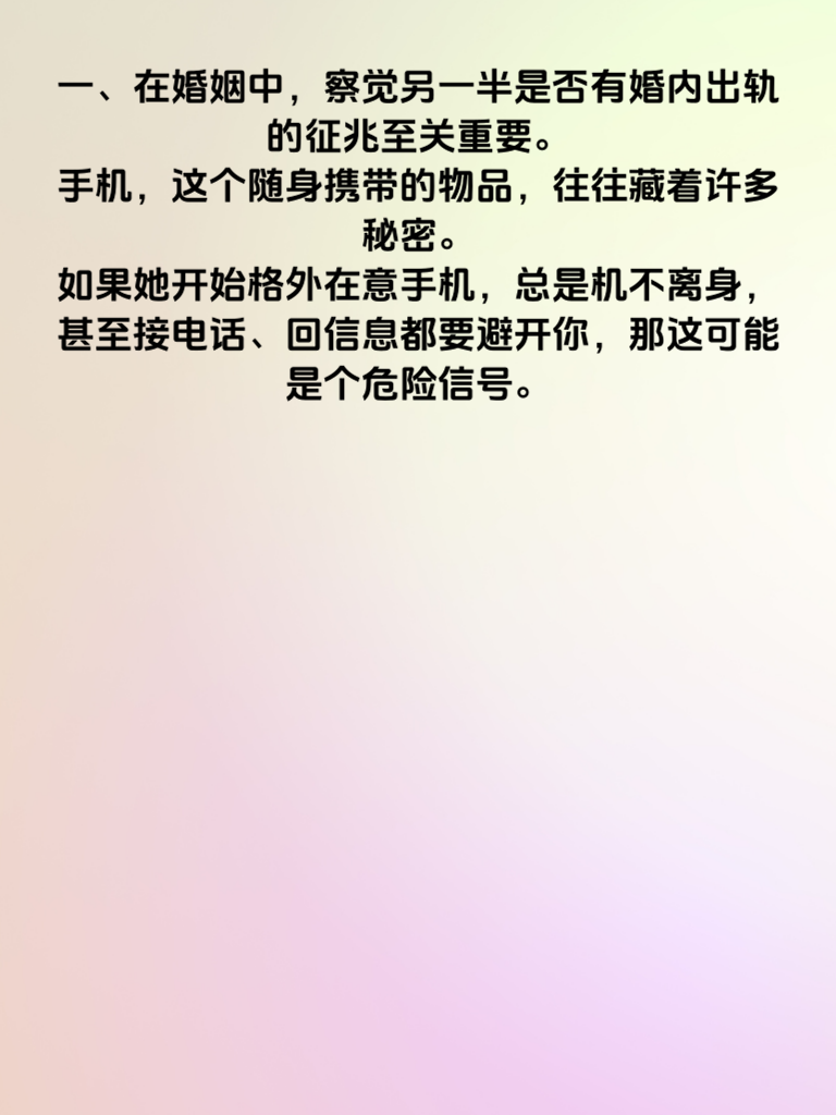 一、在婚姻中,察觉另一半是否有婚内出轨的征兆至关重要。手机,这个随身携带的物品,往往藏着许多秘密。如果她开始格外在意手机,总是机不离身,甚至接电话、回信息都要避开你,那这可能是个危险信号。 二、她手机里的社交软件使用习惯也可能透露出端倪。比如,突然增加了与某个特定异性的聊天频率,聊天记录还总是删除得干干净净。或者在一些社交平台上,频繁与某个人互动,却对你隐瞒。 三、再者,她的手机密码或许也有变化。原本你知道的密码,突然变得难以知晓,甚至她设置了新的复杂密码。这很可能是她想在手机里藏些不想让你看到的秘密。 四、还有,当她外出时,手机的状态也值得留意。如果她经常找借口出去,回来后手机电量消耗异常快,或者有不明的电量增加,这背后可能有着不可告人的秘密。发现这些征兆时,不要急于下结论,冷静沟通,才能更好地解决问题,守护婚姻。
