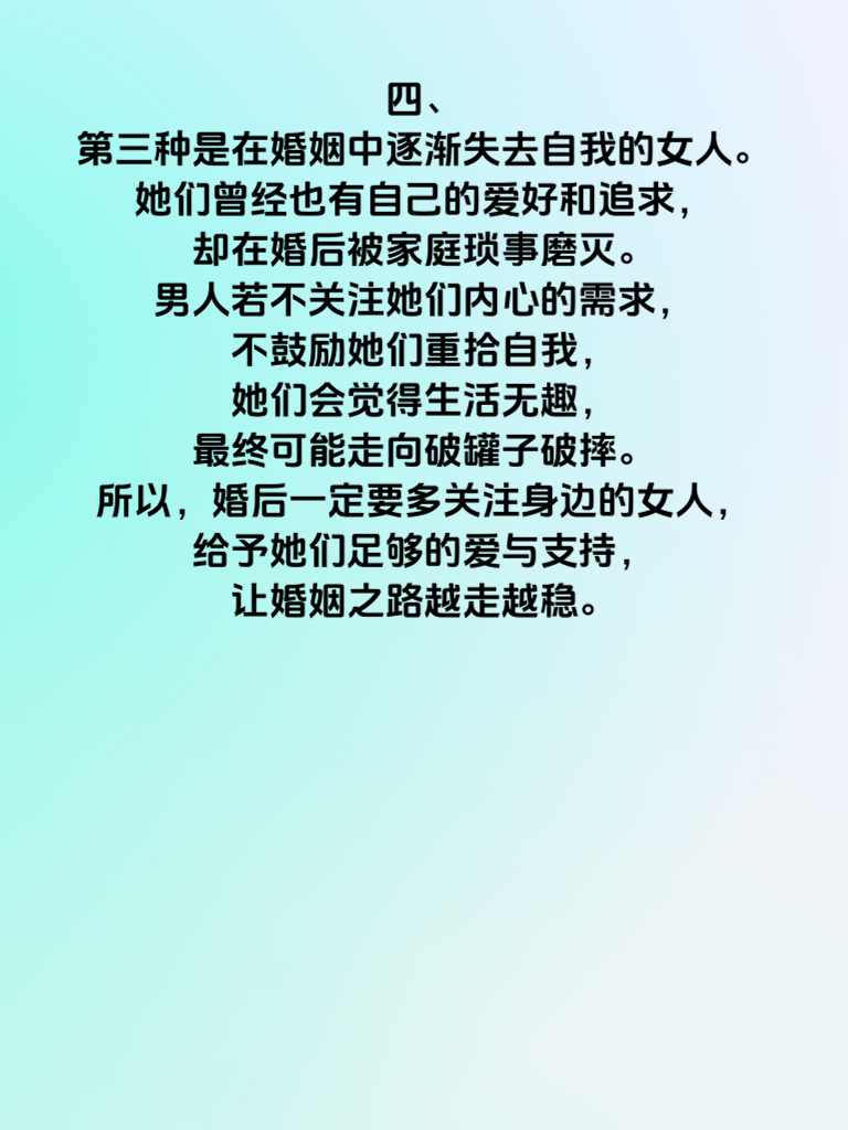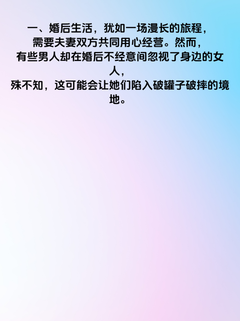 一、婚后生活,犹如一场漫长的旅程,需要夫妻双方共同用心经营。然而,有些男人却在婚后不经意间忽视了身边的女人,殊不知,这可能会让她们陷入破罐子破摔的境地。 二、第一种容易被忽视的女人,是为家庭默默付出一切的全职太太。她们放弃了自己的事业和梦想,一心扑在家庭琐事上。若丈夫长期无视她们的付出,不给予应有的关心和尊重,她们会觉得自己的价值被否定,进而可能对生活失去热情,变得消极对待。 三、第二种是为了家庭努力打拼事业的职场女性。她们在工作中承受着巨大压力,回到家还得兼顾家庭。当丈夫不理解她们的辛苦,不帮忙分担家务,甚至对她们的工作成果毫无认可时,她们很容易心灰意冷,开始自我放弃。 四、第三种是在婚姻中逐渐失去自我的女人。她们曾经也有自己的爱好和追求,却在婚后被家庭琐事磨灭。男人若不关注她们内心的需求,不鼓励她们重拾自我,她们会觉得生活无趣,最终可能走向破罐子破摔。所以,婚后一定要多关注身边的女人,给予她们足够的爱与支持,让婚姻之路越走越稳。