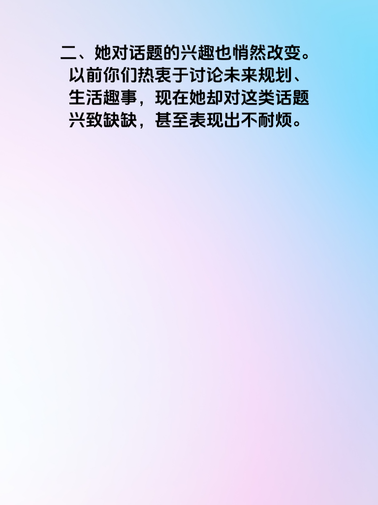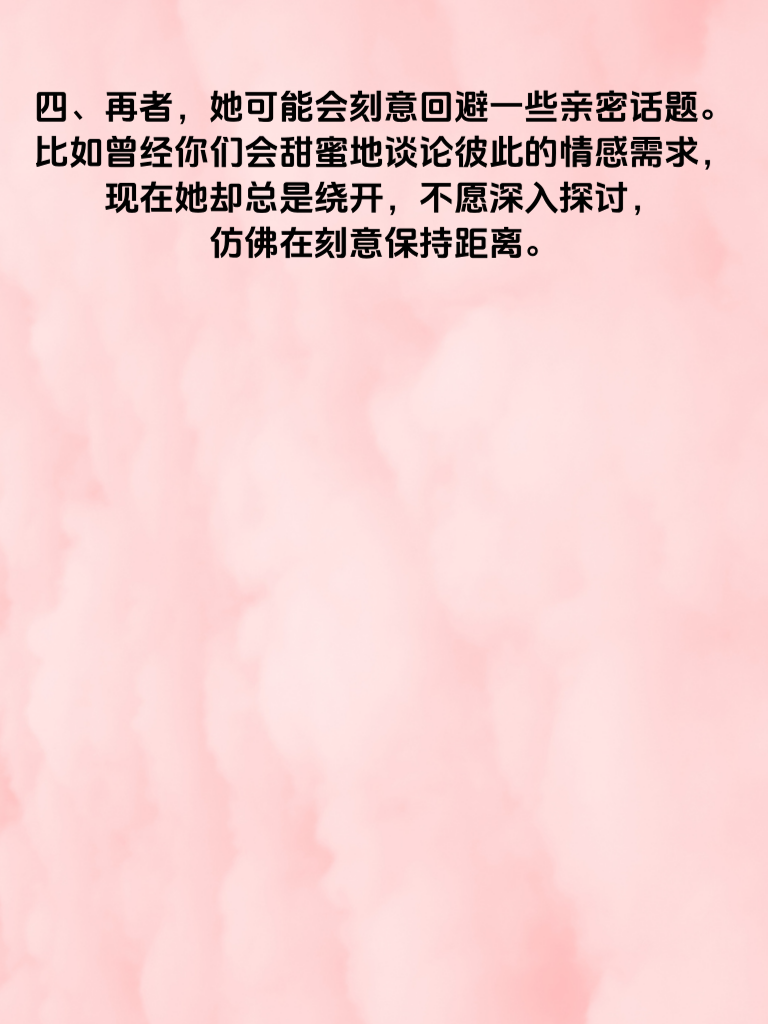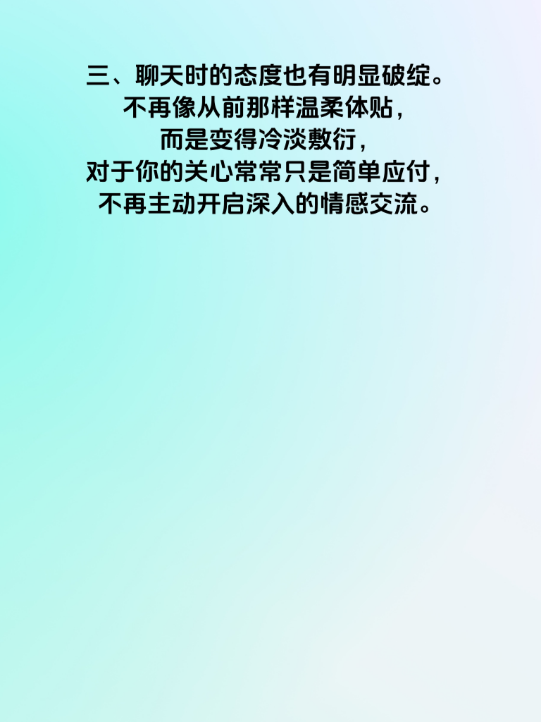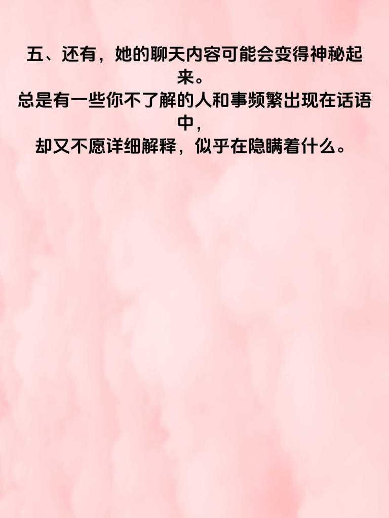 一、女人出轨后,在聊天中常常会不自觉地减少与你的交流时间。以往可能会和你畅聊一整天,分享生活点滴,现在却总是借口忙碌,回复变得迟缓且简短。 二、她对话题的兴趣也悄然改变。以前你们热衷于讨论未来规划、生活趣事,现在她却对这类话题兴致缺缺,甚至表现出不耐烦。 三、聊天时的态度也有明显破绽。不再像从前那样温柔体贴,而是变得冷淡敷衍,对于你的关心常常只是简单应付,不再主动开启深入的情感交流。 四、再者,她可能会刻意回避一些亲密话题。比如曾经你们会甜蜜地谈论彼此的情感需求,现在她却总是绕开,不愿深入探讨,仿佛在刻意保持距离。 五、还有,她的聊天内容可能会变得神秘起来。总是有一些你不了解的人和事频繁出现在话语中,却又不愿详细解释,似乎在隐瞒着什么。