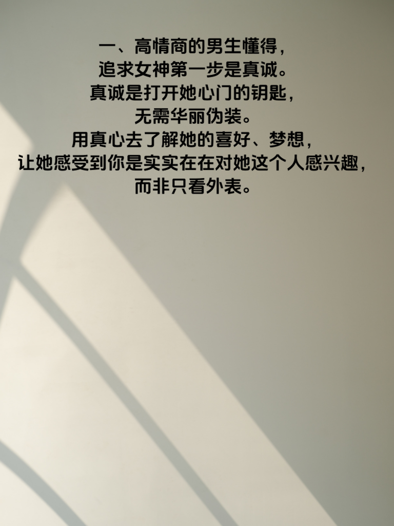 一、高情商的男生懂得,追求女神第一步是真诚。真诚是打开她心门的钥匙,无需华丽伪装。用真心去了解她的喜好、梦想,让她感受到你是实实在在对她这个人感兴趣,而非只看外表。 二、第二步是细心。留意她生活中的点滴细节,她不经意的一句话、一个小烦恼。在她需要时及时出现,送上贴心关怀。比如她生病时的一句问候、一份温暖的粥,会让她心里满是感动。 三、第三步是尊重。尊重她的想法、选择和决定,不强行将自己的意愿加于她。即使有不同意见,也能心平气和沟通,让她在你这里有充分的自由和被尊重感。 四、第四步是适时展现魅力。通过自身的才华、上进心等散发独特魅力。比如在工作上努力进取,在兴趣爱好中发光发热,吸引她由衷欣赏你,从而一步步走进她的心,成功追到女神。
