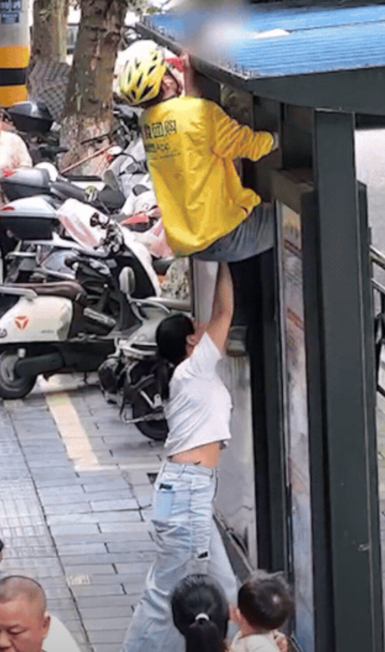 黄成路过瞧见这情景,啥也没想就停了车,抱着公交站牌往上爬。旁边一个大姐赶紧跑过来,还喊了其他人:“快搭把手,托着他点!” 几个人在下面稳稳托着黄成的腿,帮他往上推。