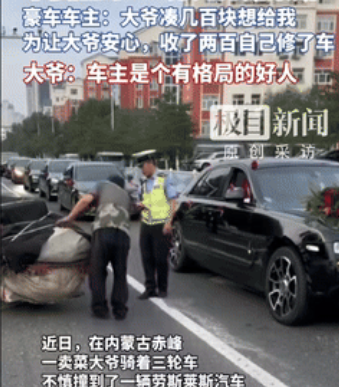 活该他发财!”内蒙古赤峰,一卖菜大爷骑着三轮车,不慎撞到了一辆价值600万元的劳斯莱斯,大爷凑了几百块想赔给车主,谁料,车主考虑到大爷赚钱不易,之前还患有脑血栓,就婉拒了大爷,可大爷执意赔钱,车主为让大爷安心,象征性收了200元,网友:车主是个很有格局的人! 据极目新闻8月21日消息,车主将爱车装饰一番,只为能让新郎新娘留下美好的回忆,他在路上正常行驶,后面也跟着不少车,浩浩荡荡的阵势吸引了不少的目光。 他看到红灯后,就停在白线内等待,突然他听到车被撞击的声音,车主顾不得那么多,急忙下车查看情况,结果就看到一位手足无措的大爷,呆呆的望向他。 豪车被蹭的地方还挺多的,维修下来需要不少钱,车主报了警,毕竟他还要接亲,吉时不能耽搁,交警做了简单的登录后,就留下来双方的联系方式,忙完各自的事情后在解决。 车主接到交警的电话后,便来到了派出所,大爷早早就在等他了,一看到车主,他立马对车主道歉,交警勘测完现场,这场事故的主要负责就是大爷。 所以维修费按理说应该是大爷出,但大爷的状况,车主都看在眼里,能维持自己的生计都不错了,对于大爷来说,几百块钱已经是他能凑到的最大限额了。 车主思来想去还是决定,维修费自己出,4S店检查后,把车修好得花数十万元,大爷肯定是拿不出来的,索性不为难大爷了,只是简单收了一点,大爷很不好意思,于是告诉车主会上门感谢。 对于这件事情,大家有什么看法?