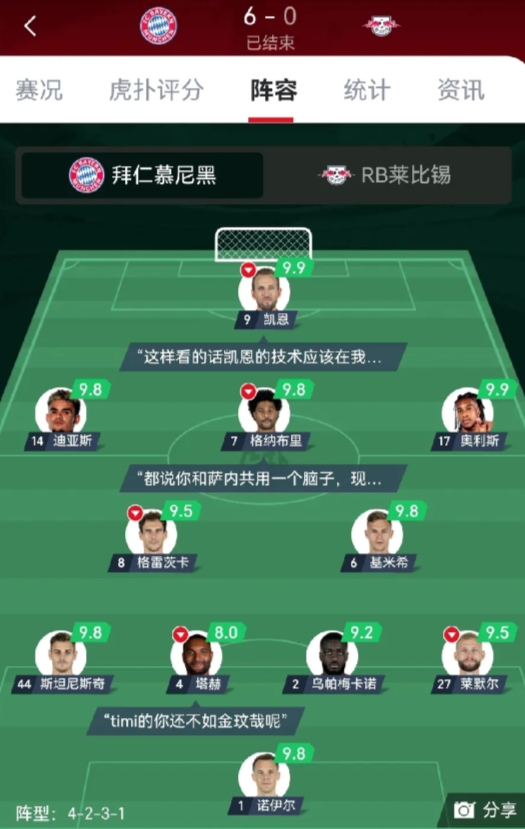 太残暴了!拜仁这阵容除了单薄外堪称完美啊。英超即战力的含金量还在上升。凯恩,迪亚斯,奥利塞这仨踢德甲有点欺负人了。 这场比赛也体现出萨内的离开是多么的正确。现在这支拜仁不仅前场流畅度变高了,连射术都变好了,连小黑胖子都活了,感谢加拉塔萨雷老铁。 看完揭幕战,这赛季的德甲又没悬念了,可以直接颁发冠军给拜仁了。工资凯恩又提前预订了一个冠军。 希望拜仁别因为一场大胜就不买人了,留住大金子,再买个替补中锋和一个替补边锋就可以了。
