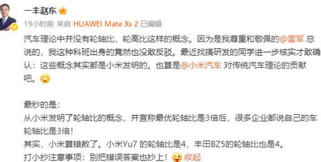 近日,一汽丰田赵东发文质疑小米YU7的“轮轴比”说法。他指出小米宣称的