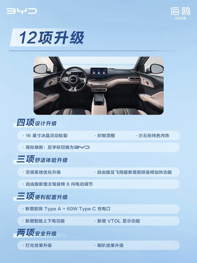 25款的海鸥看了一下配置真不大,看了下这些配置折算成24款现金优惠感觉更香! 外观方面 就是尾部标变成了BYD,然后就是轮毂造型变化,这款车我完全不考虑轮毂好不好看,代步车没必要,大灯说是更新了灯组,所以就亮更远了。 然后就是粉色内饰的门板和前排的小波点去掉了,我一男的选内饰也不会去看粉色,同样无关紧要。 配置变化 1⃣️全系都取消了卡片钥匙,增加了智能上下电功能,我可能还是比较传统一些,一些电车取消了一键启动我还不习惯,上车老是在找一键启动按钮,所以这个智能上下电对我来说确实是不痛不痒。 2⃣️全系增加的Type-C充电口,首先这个车本身对我来说只是个代步买菜车,我肯定不会开它去远的地方,电不用补能的时候我手机基本也不用补能,虽然功率达到60W很顶,但我还真不会去用,毕竟又不是没有无线充电。 3⃣️自由版和飞翔版增加了座椅加热,主驾6向电动调节,这个倒是还不错哦,尤其是座椅加热天冷了可以舒适一些。 4⃣️最后就是喇叭从单喇叭变成了双喇叭,就是更响了些,空调加强了一些制冷效果出风之类的,这个我只担心还会不会喷粉而已。 所以就这个上面而言,我只是对座椅加热感兴趣而已。 选买相关 1⃣️305KM的活力版连远近灯的LED都没有就算了吧,我觉得这个毕竟影响到了安全的。 2⃣️305KM自由版和飞翔版只是一个续航的差别罢了,305KM在冬季肯定是遭不住的,打个75折就只剩220多续航了,但是1万块钱差价只是增加了100KM续航我又觉得405KM飞翔版的性价比不高,毕竟8.58的价格再加上保险都要9个多了,这么小的代步车9个多是不是太贵了些? 3⃣️而25款上市之后24款的库存肯定是要降价的,这么说起来,首先本身充电也比较方便,而25款增加的配置对我来说需求又不高,我倒是觉得不如去考虑下24款的自由,谈谈价格能够5K以上的优惠岂不是更好!