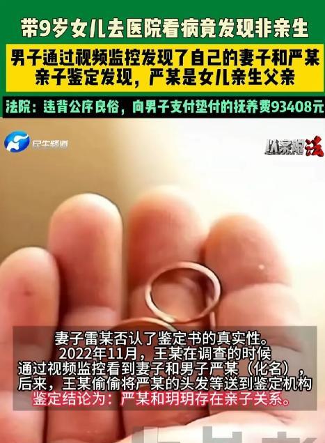 湖北枣阳,男子带9岁女儿去医院看病时,发现女儿血型与自己不匹配,男子越想越不对,赶紧做了亲子鉴定,结果显示,女儿果然不是他亲生的。同床共枕的妻子竟给自己戴了这么大一顶绿帽子,男子气炸了,开始暗中调查,很快在监控视频发现了妻子的秘密,也找到了孩子的亲生父亲。为了出这口恶气,男子将妻子和第 三者告上法庭,索赔11万。 “我把她当亲生闺女养了九年,结果竟是被戴九年的绿帽子,这口气谁能咽得下!”男子王某(化名),怎么都想不到,一次带 9 岁女儿看病的经历,会扯出这样让他颜面尽失、愤怒至极的事儿! 根据8月12日的报道,王某和妻子雷某(化名)结婚多年,婚后育有两个女儿,日子看似平淡幸福。平日里,王某忙着挣钱养家,对妻子和孩子也算尽心尽力。 事发当天,王某像往常一样,带着 9 岁的小女儿去医院看病,看病过程中,顺带做了个血型检测。拿到结果时,王某发现女儿的血型和自己完全不匹配。这一下,让王某越想越觉得不对劲。 王某是个较真的人,心里存了疑,就一定要弄清楚。他咬咬牙,带女儿去做了亲子鉴定。当亲子鉴定结果摆在眼前,显示女儿并非自己亲生时,王某只觉得愤怒、羞辱、难以置信各种情绪一股脑涌上来。 他开始暗中调查,先是留意妻子雷某的行踪,观察她和哪些人来往密切。后来,他想到从监控视频入手,一家家查看妻子可能去过地方的监控,很快锁定了孩子的亲生父亲严某(化名)。 这口气王某实在咽不下去,于是,王某一纸诉状把妻子雷某和第三者严某告上了法庭,索赔 11 万。他觉得这些年自己为养这个女儿,付出了金钱、精力还有感情,如今全成了笑话,必须得让对方赔偿自己的损失,也得让他们为违背道德和法律的行为负责。 经过法院审理,认为严某和雷某的行为违背了公序良俗,得分别承担相应的民事责任。而且严某的行为符合不当得利的法定构成要件,王某享有不当得利返还请求权。最终,法院判定严某应支付小女儿从 2014 年 7 月至 2023 年 1 月期间的抚养费 93408 元 。 消息传出来后,在网上引发了不少讨论。 有网友说:“这男的太惨了,九年的付出,感情和金钱都打了水漂,还好法律给了他公道。” 也有网友感慨:“婚姻里忠诚太重要了,一旦背叛,伤害的是几个家庭,尤其是孩子,太可怜了。” 这件事它让大家看到,婚姻需要忠诚来维系,一旦一方背叛,不仅会伤害伴侣,破坏家庭,还会让孩子成为无辜的受害者,陷入复杂又难堪的处境。 对于这件事情,你们怎么看?