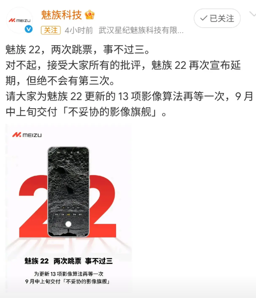 魅族22又双叒延期了!8月22日魅族科技官方致歉,称新机再次跳票,但承诺“事不过