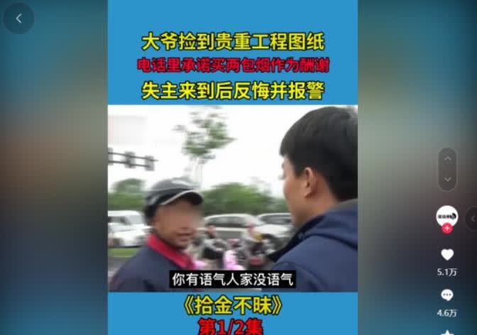 这样的人难成大事!浙江,一大叔等红绿灯时捡到一包工程图纸,连忙按照图纸上的电话联系了失主。失主是个女子,在电话中承诺给2包香烟以此感谢。大叔在雨中等了半小时后一个男子来了,不仅没有感谢,反而说只愿意给10块钱,爱要就要,不要拉倒。大叔咽不下这口气,认为男子没有诚信。谁曾想男子直接报警,民警到场后,男子的一句话直接让他傻眼了 在一个下雨的浙江街头,周大叔在等红绿灯时,意外捡到了一包工程图纸。好心眼的他,想着得赶紧还给人家,就联系了失主。本来吧,这事儿挺温馨的,结果因为失主那边的不领情和不讲信用,最后闹得挺不愉快。 当时周大叔就在雨里站着,手里拿着图纸,一直等着。失主那边,一开始说好了要给两包烟作为感谢。可等了半小时,来的却是个男的。他连句谢谢都没有,就直接扔下一句:“给你10块钱,拿走。” 周大叔当时都懵了。他要的不是烟,也不是钱,就是要个信守承诺和尊重。他拒绝了那10块钱,想让对方按说好的来。但那男的态度特别强硬,还有点看不起人的样子。吵架时,那个男人直接打了110。警察一来,周大叔刚想开口说说情况,那个男人却蹦出一句让人大跌眼镜的话:“我给他10块钱他都不要,图纸我也不要了!” 当时,周大叔整个人都懵了。他怎么想也想不通,自己好心好意帮忙,咋就换来了这样的对待。 后来在警察的劝说下,那个男人拿回了图纸,而周大叔说啥也不要任何回报,悄悄地就走了。事情是结束了,但那种心里头的不是滋味,却好久都没散去。